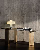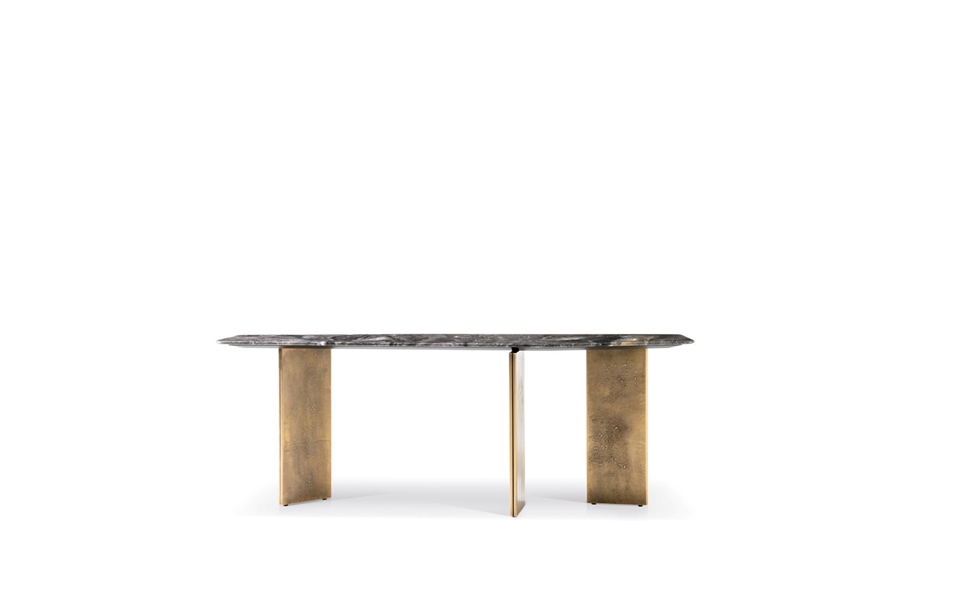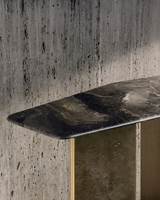 A furnishing piece which features a distinctly decorative aesthetic and refined proportions, distinguished by a wooden top or in a wide selection of precious marble or stone options. The Yves console is developed following the identical architectural geometry, available in the same finishes as the coffee table, presenting an irregular form top. It appears to be suspended on the signature double shaped rounded legs, arranged asymmetrically.