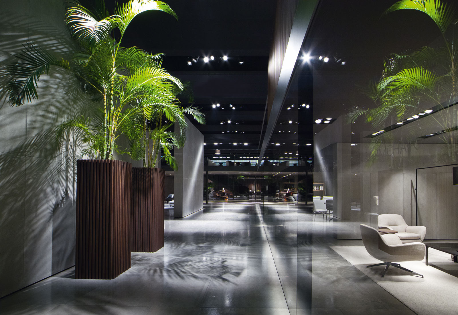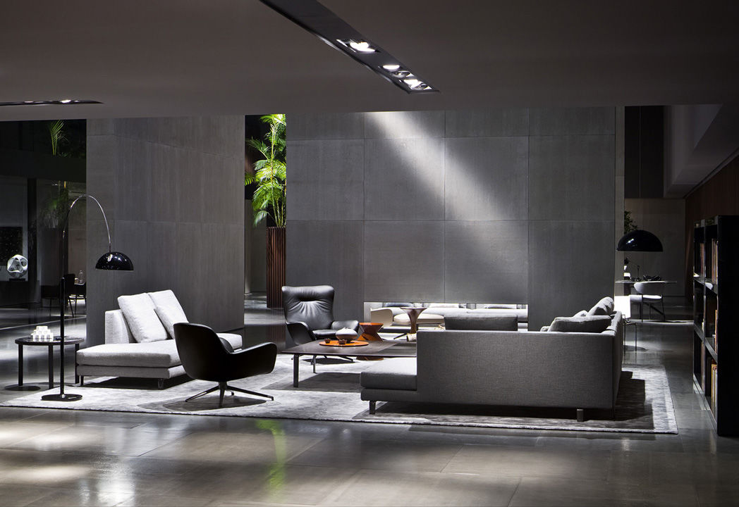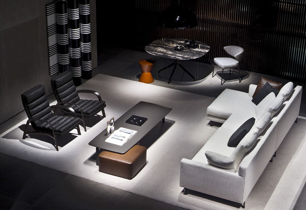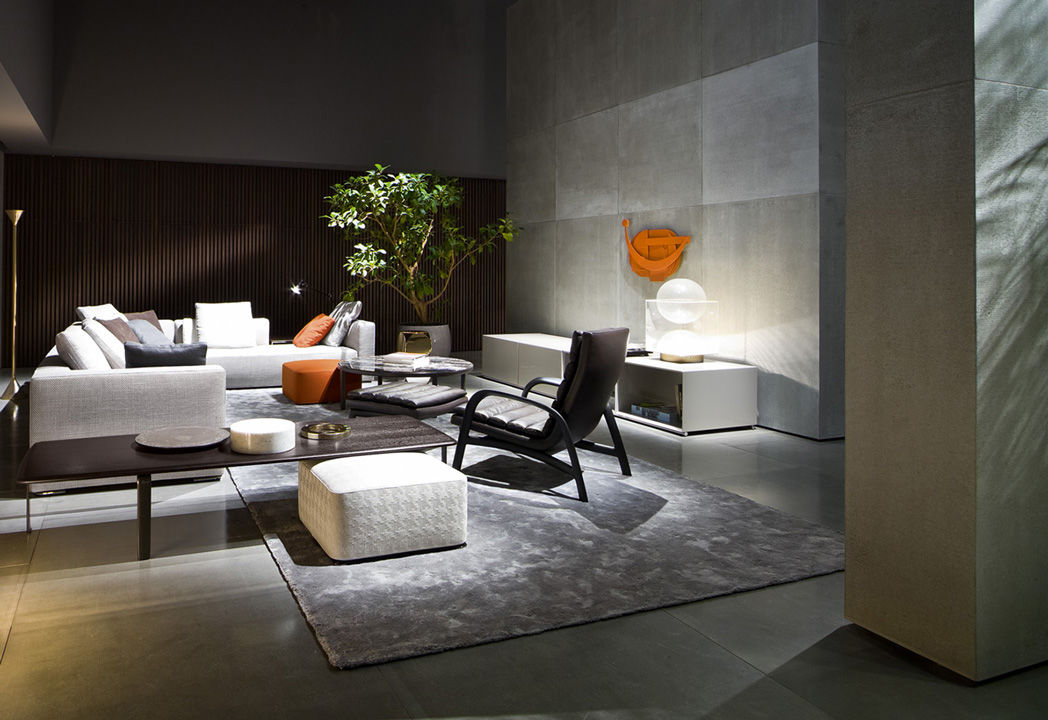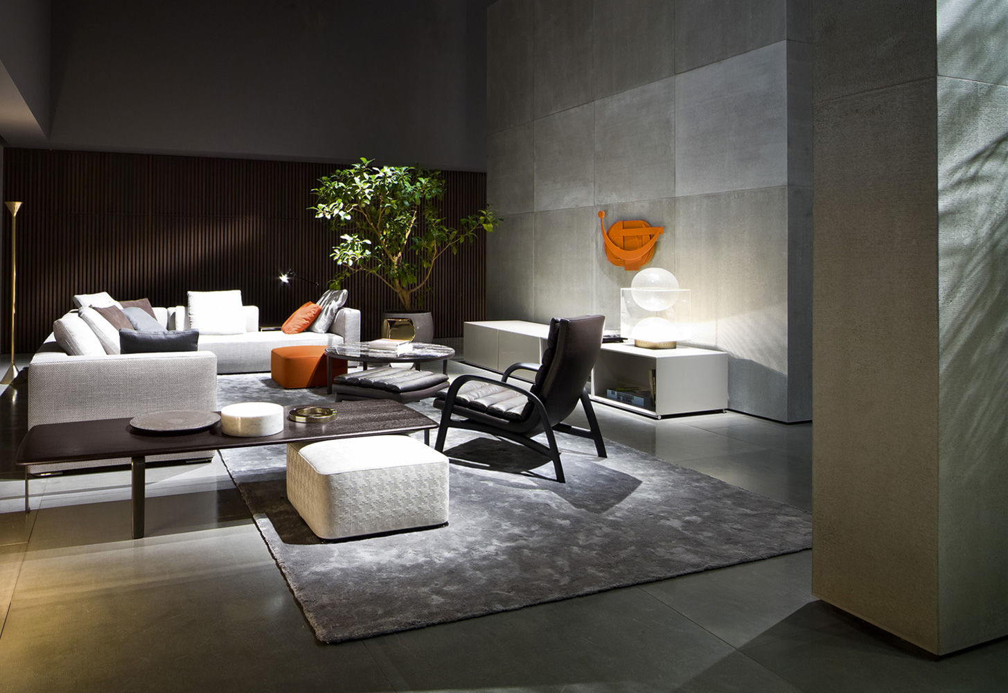 Una trayectoria vertical guía la mirada desde el suelo de cemento, signo del patrimonio estilístico de las instalaciones Minotti, hasta una instalación luminosa de desfile situada a seis metros de altura, que cumple la delicada misión de esculpir las formas de los productos y de los objetos. La atmósfera es realmente sugestiva. Todos los elementos de estilo que completan el producto, de su sofisticada selección de objetos a los elementos especiales de iluminación, concurre a producir un impactante efecto decorativo.
