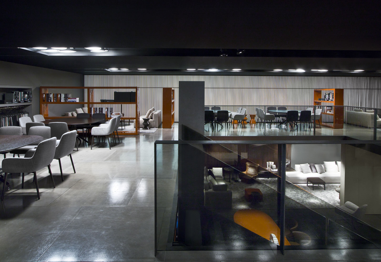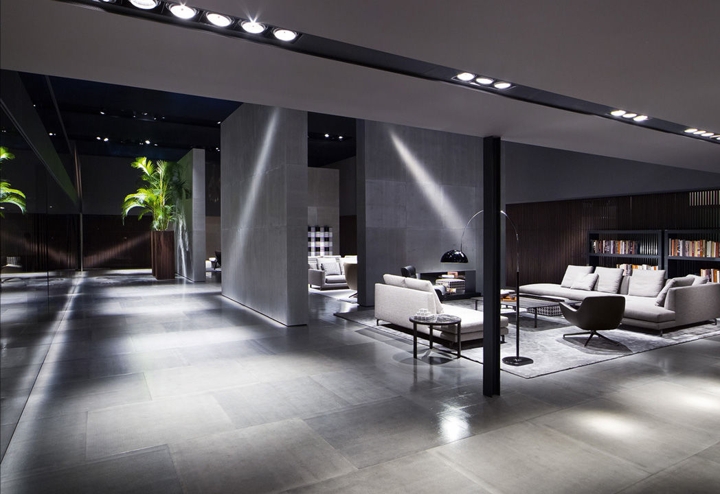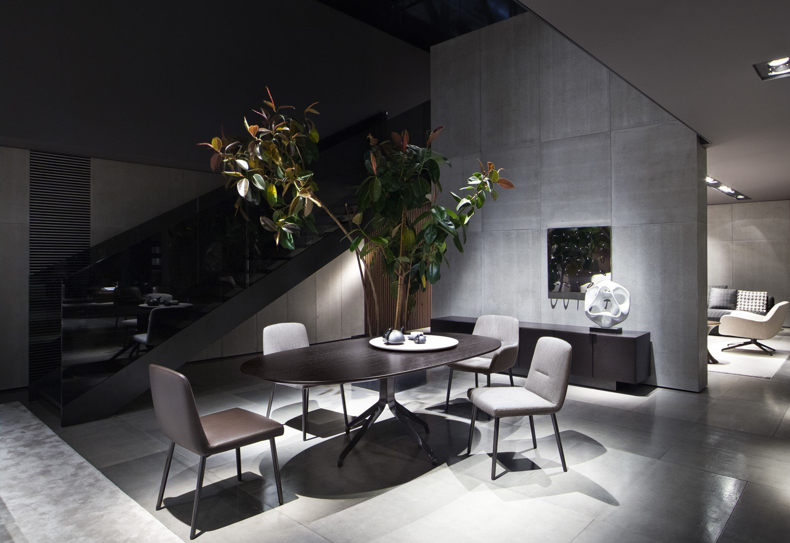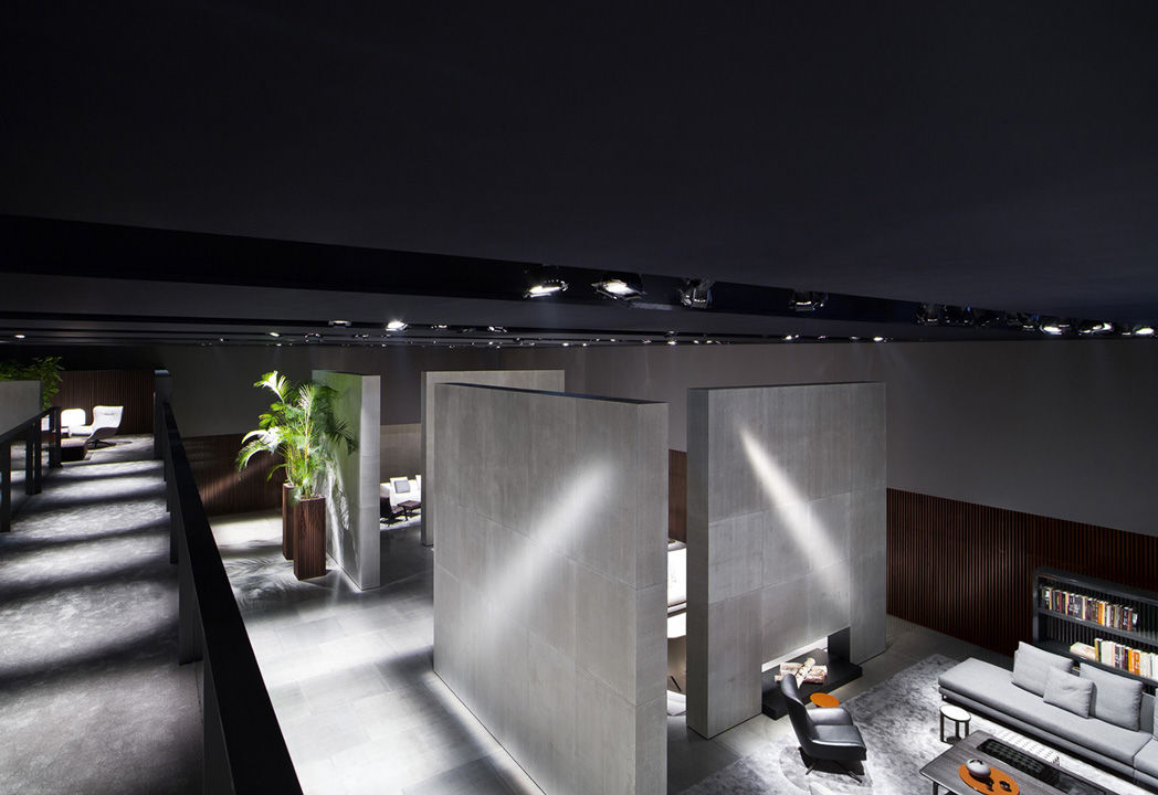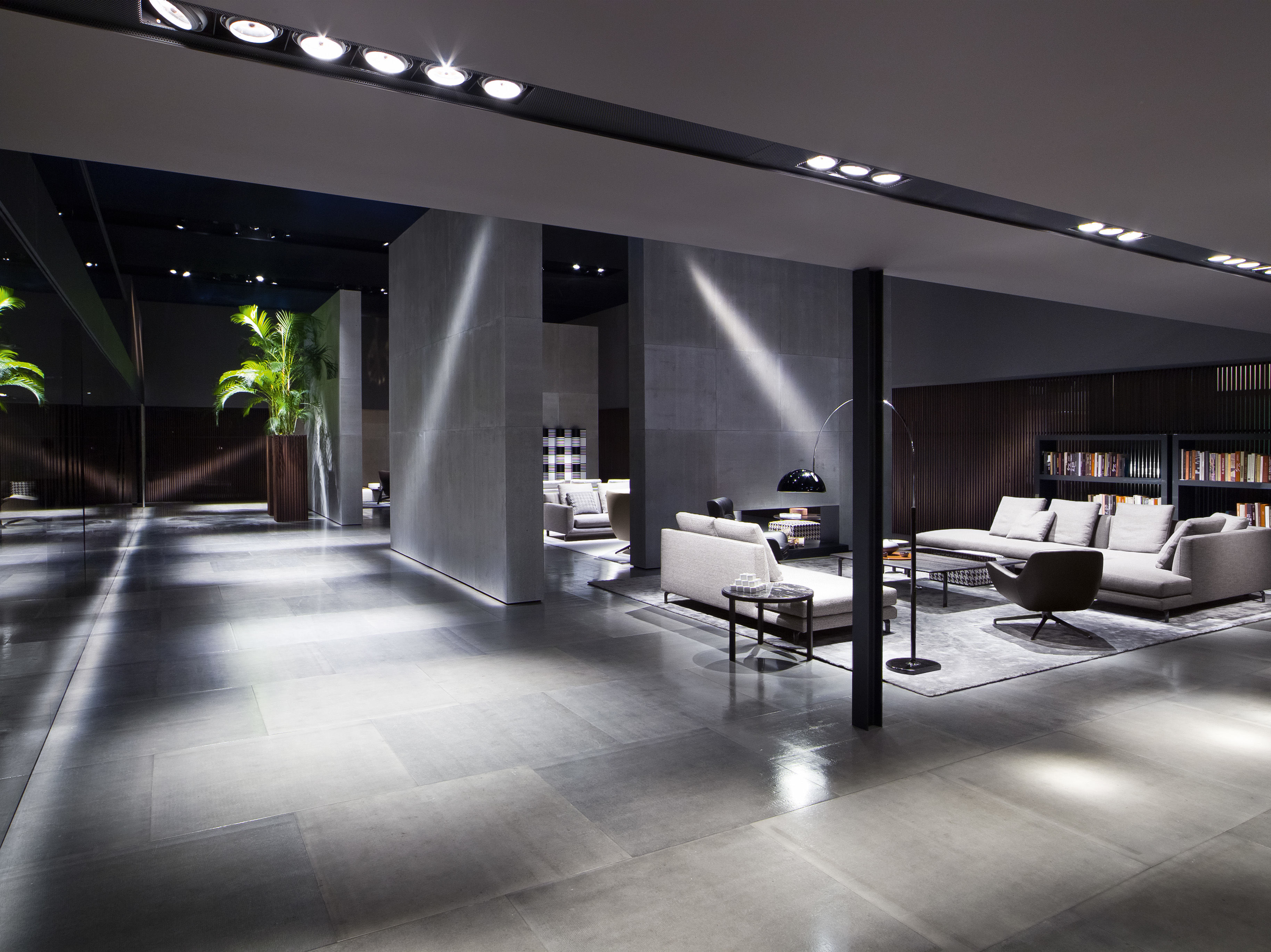 Una trayectoria vertical guía la mirada desde el suelo de cemento, signo del patrimonio estilístico de las instalaciones Minotti, hasta una instalación luminosa de desfile situada a seis metros de altura, que cumple la delicada misión de esculpir las formas de los productos y de los objetos. La atmósfera es realmente sugestiva. Todos los elementos de estilo que completan el producto, de su sofisticada selección de objetos a los elementos especiales de iluminación, concurre a producir un impactante efecto decorativo.