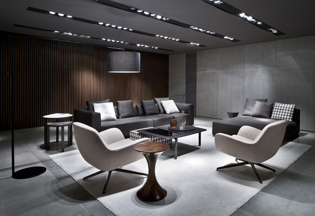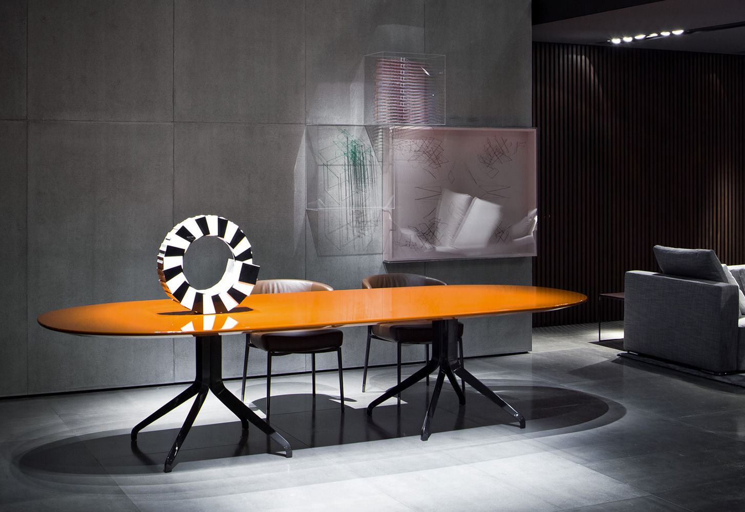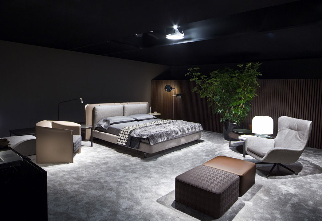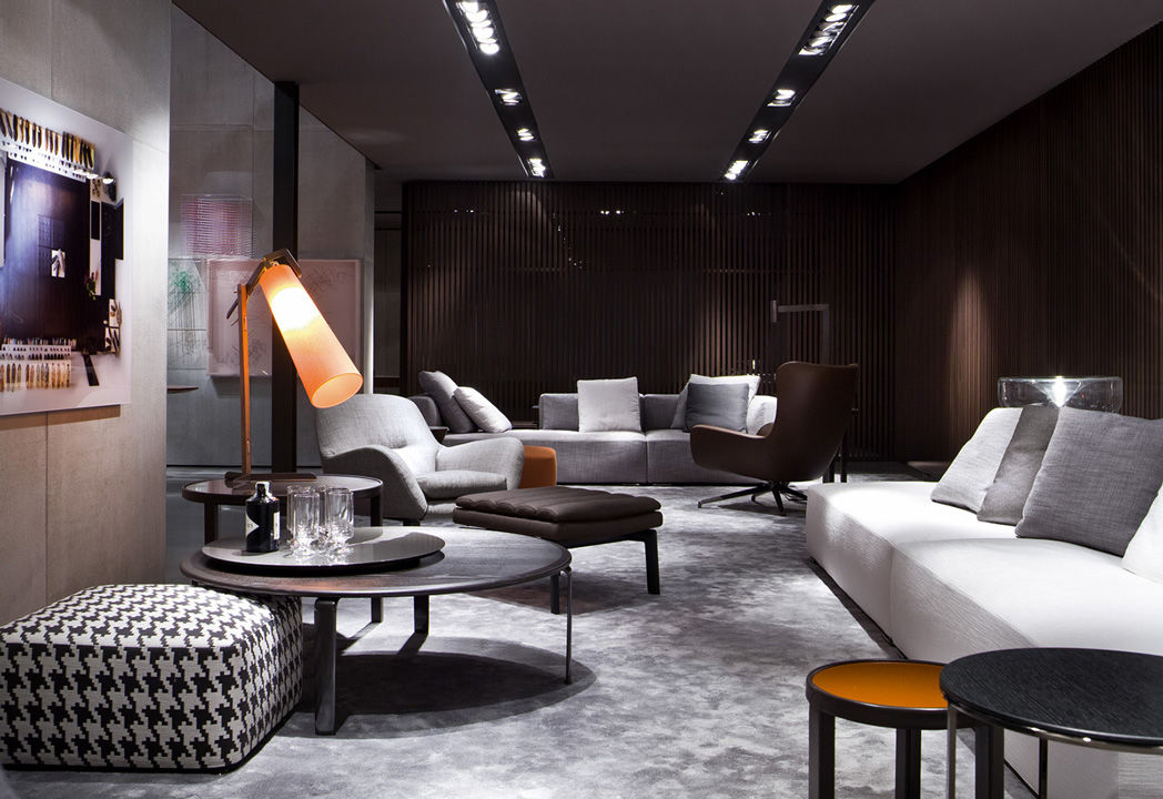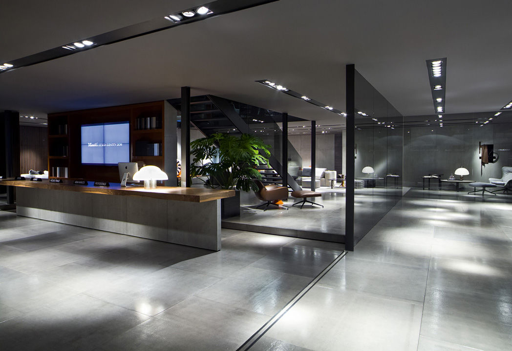 Una trayectoria vertical guía la mirada desde el suelo de cemento, signo del patrimonio estilístico de las instalaciones Minotti, hasta una instalación luminosa de desfile situada a seis metros de altura, que cumple la delicada misión de esculpir las formas de los productos y de los objetos. La atmósfera es realmente sugestiva. Todos los elementos de estilo que completan el producto, de su sofisticada selección de objetos a los elementos especiales de iluminación, concurre a producir un impactante efecto decorativo.