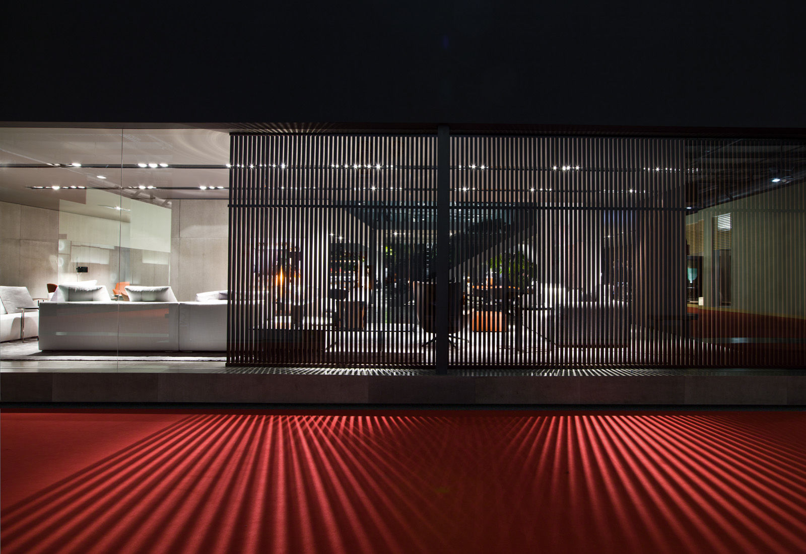 Por primera vez, las paredes externas del estand que envuelven el área expositiva se abren a la vista mediante amplias estructuras acristaladas, interpretadas en estilo contemporáneo a través de un precioso retículo vertical de láminas de madera.