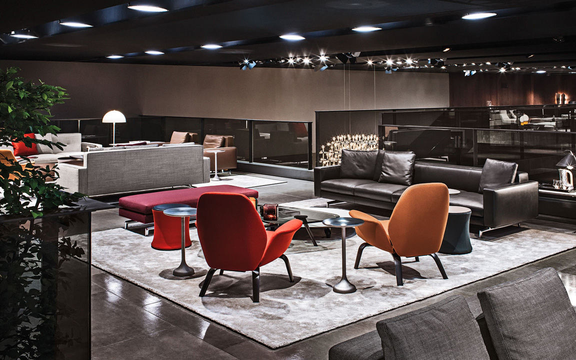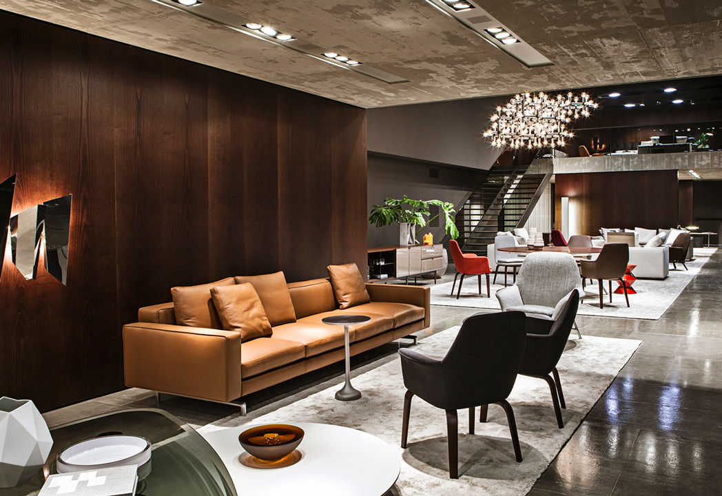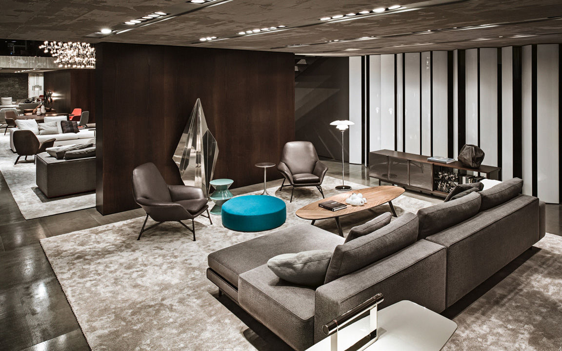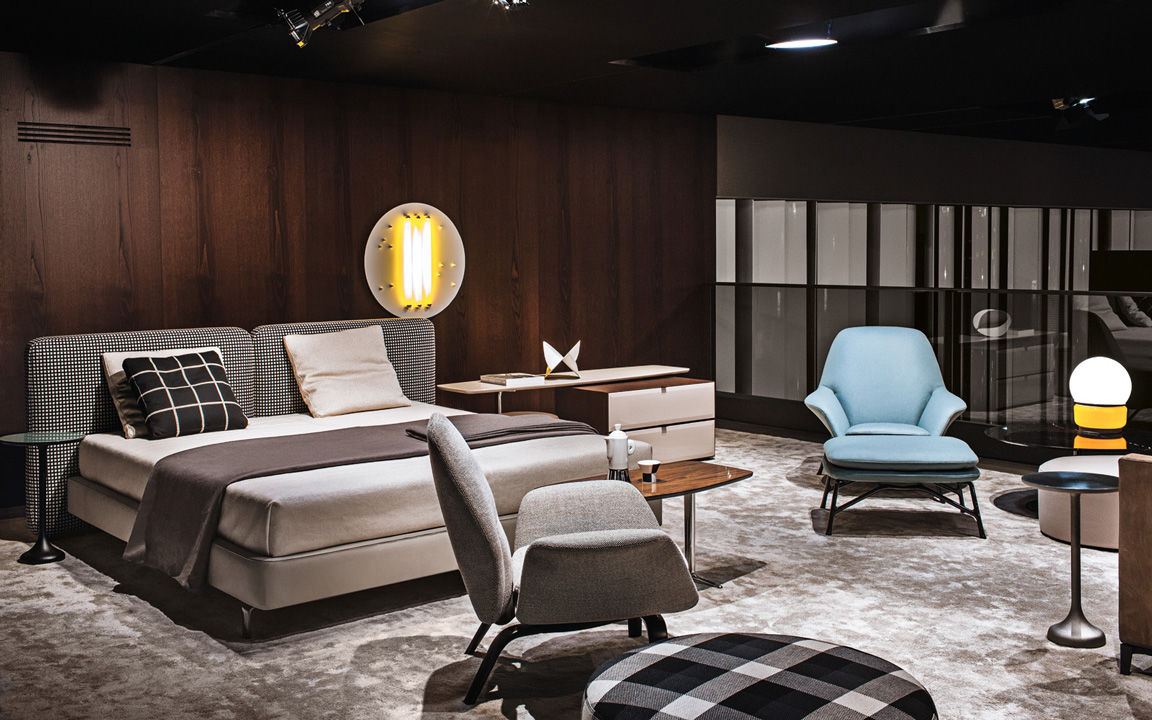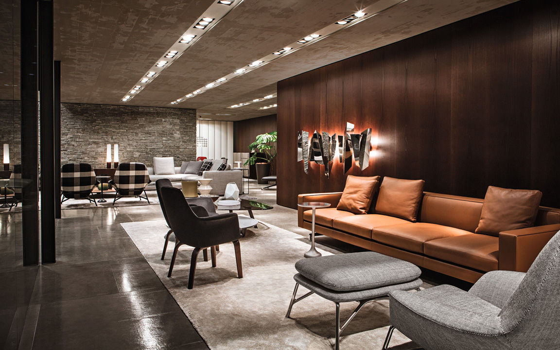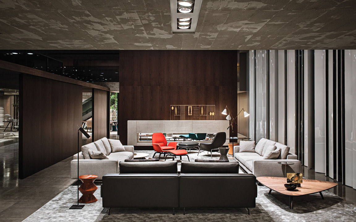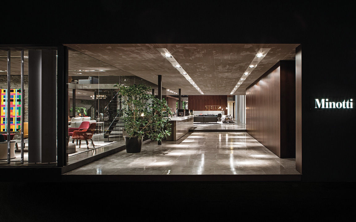 La presencia de la madera de castaño en la nueva tonalidad Tabaco, introducida este año por Minotti tanto en los acabados de los productos como en la arquitectura que los aloja, asociada al uso del cemento bruto en los techos, las sugestivas protecciones solares lacadas brillantes en color blanco, el uso de la piedra y del vidrio: todo confluye en la creación de un espacio encantador que evoca el contemporary style californiano, un hábitat ideal para los nuevos productos que se inspiran en las líneas de auténticos iconos del diseño de los años 50, con interpretaciones sumamente modernas y reinterpretadas en función de las posibilidades ofrecidas por la tecnología contemporánea.
