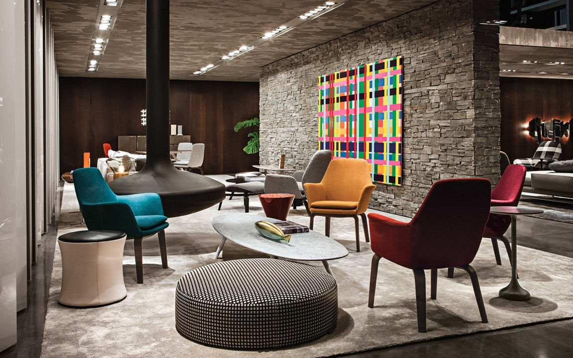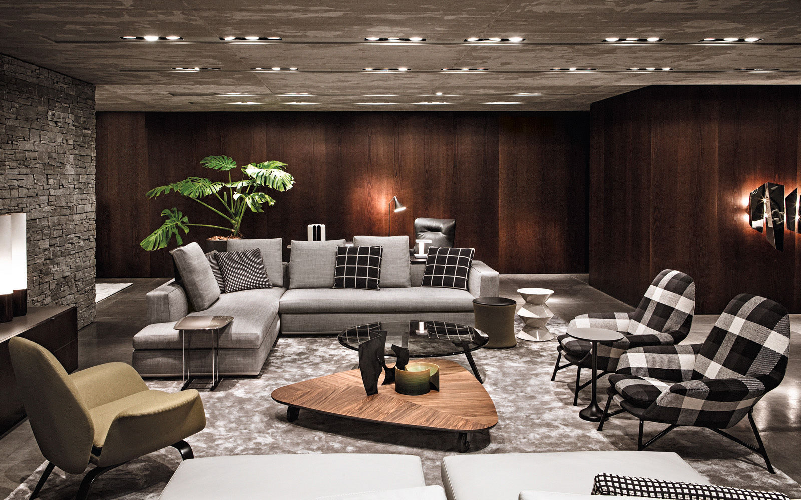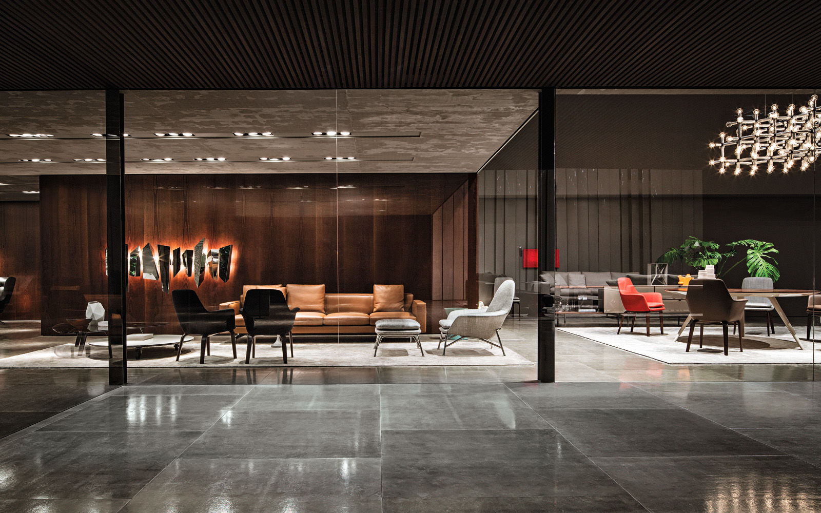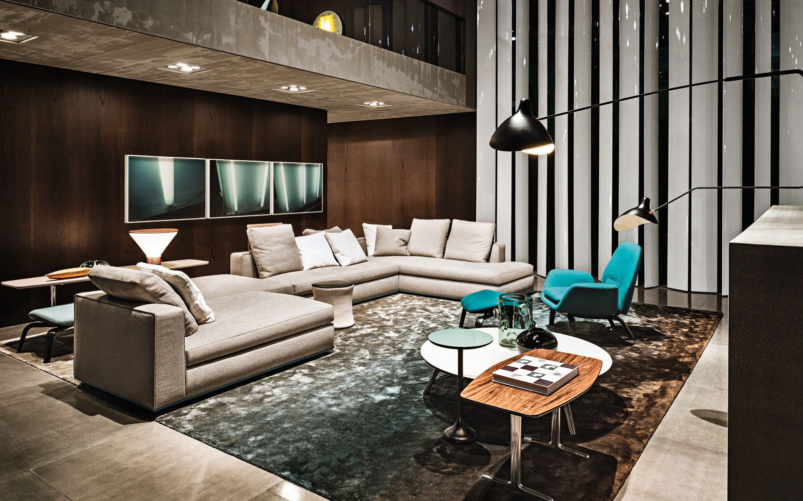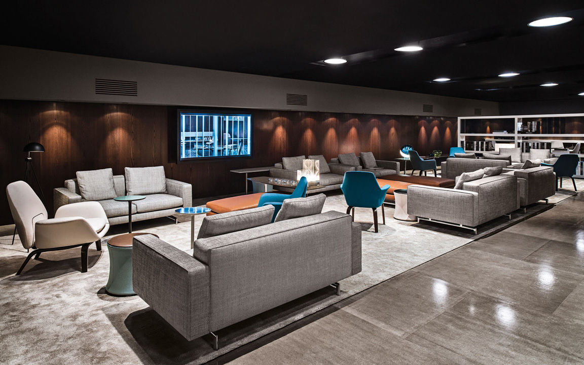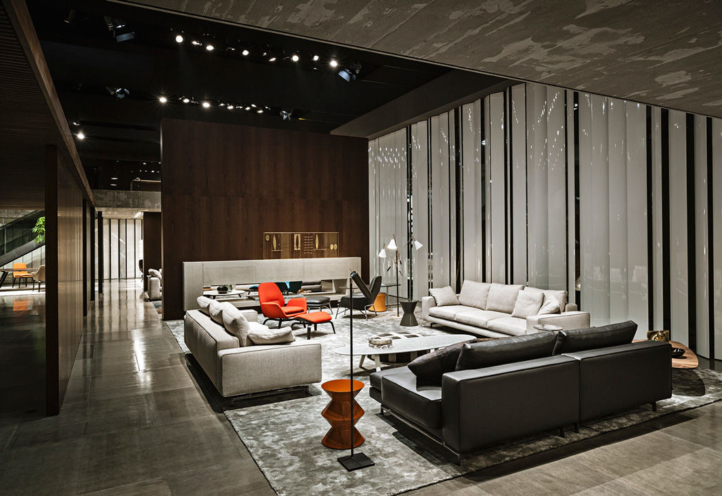 La presencia de la madera de castaño en la nueva tonalidad Tabaco, introducida este año por Minotti tanto en los acabados de los productos como en la arquitectura que los aloja, asociada al uso del cemento bruto en los techos, las sugestivas protecciones solares lacadas brillantes en color blanco, el uso de la piedra y del vidrio: todo confluye en la creación de un espacio encantador que evoca el contemporary style californiano, un hábitat ideal para los nuevos productos que se inspiran en las líneas de auténticos iconos del diseño de los años 50, con interpretaciones sumamente modernas y reinterpretadas en función de las posibilidades ofrecidas por la tecnología contemporánea.