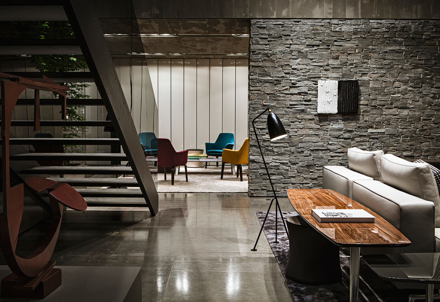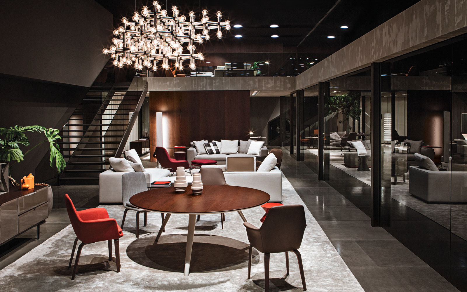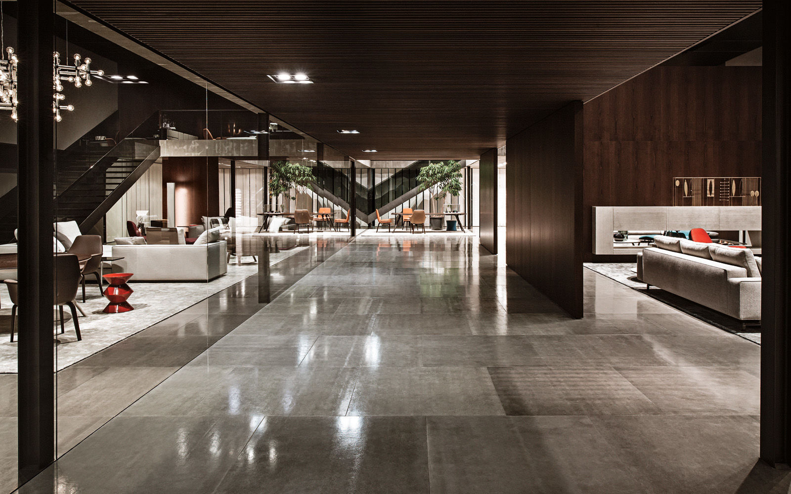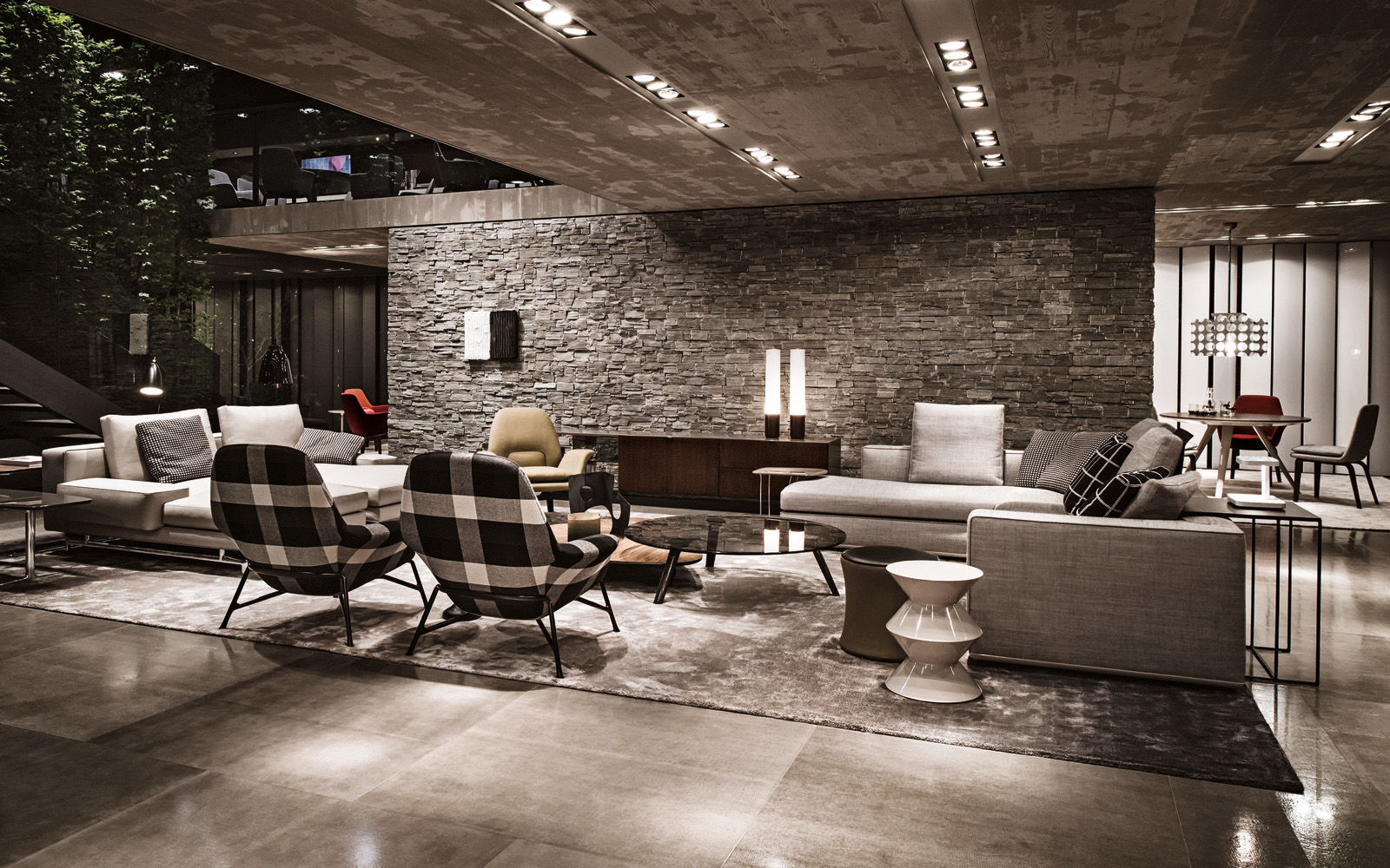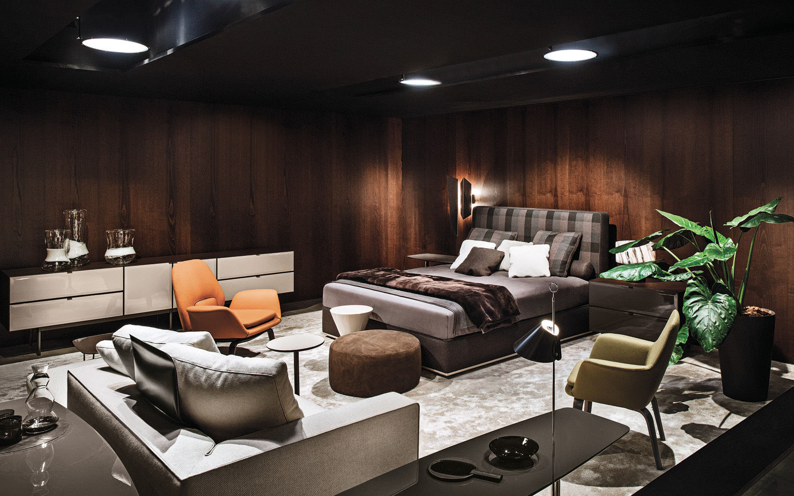 La presencia de la madera de castaño en la nueva tonalidad Tabaco, introducida este año por Minotti tanto en los acabados de los productos como en la arquitectura que los aloja, asociada al uso del cemento bruto en los techos, las sugestivas protecciones solares lacadas brillantes en color blanco, el uso de la piedra y del vidrio: todo confluye en la creación de un espacio encantador que evoca el contemporary style californiano, un hábitat ideal para los nuevos productos que se inspiran en las líneas de auténticos iconos del diseño de los años 50, con interpretaciones sumamente modernas y reinterpretadas en función de las posibilidades ofrecidas por la tecnología contemporánea.