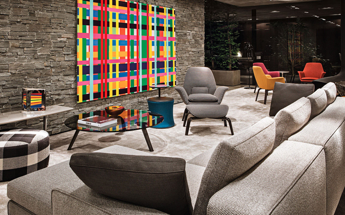 Los nuevos productos son contextualizados en el interior de una arquitectura que se encuentra en absoluta sintonía con el mood expresado por la colección. La inspiración para la arquitectura del nuevo espacio expositivo viaja al contemporary style de los años 50, reinterpretado por Minotti con una frescura y una inventiva que generan un concepto del estand gráfico y moderno.