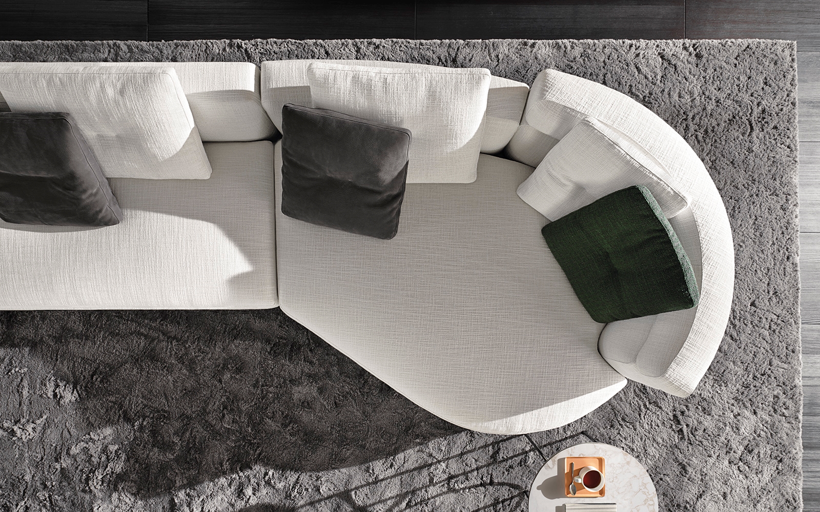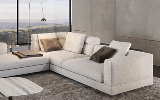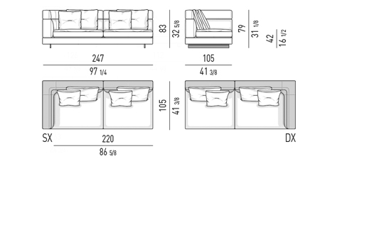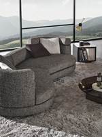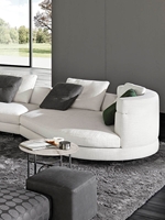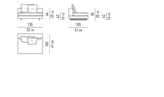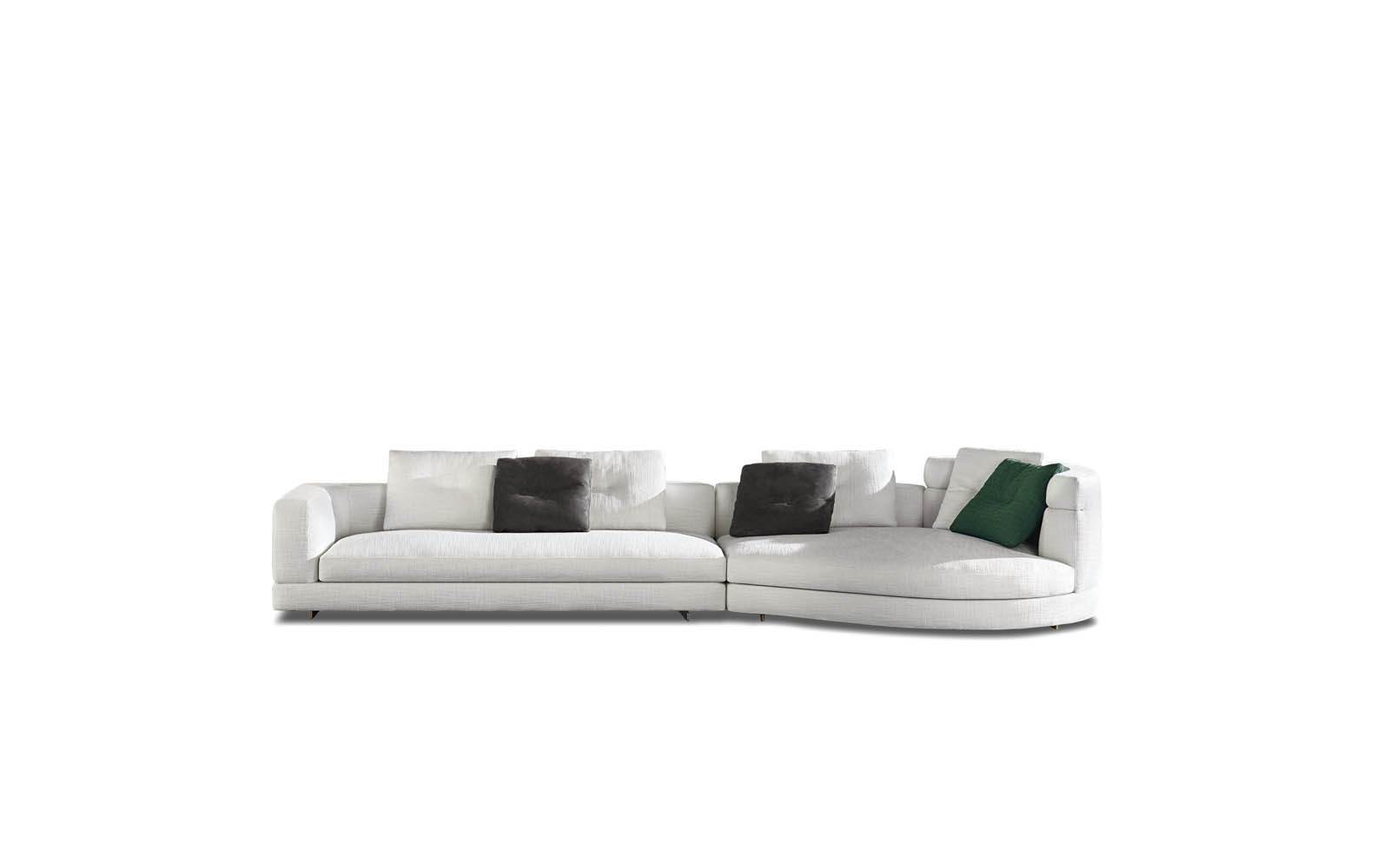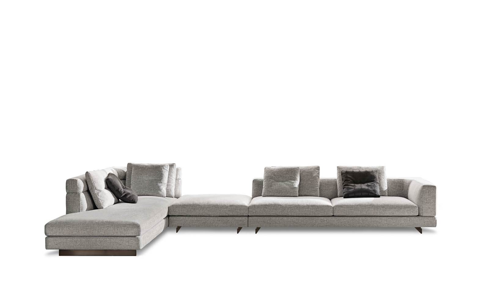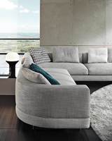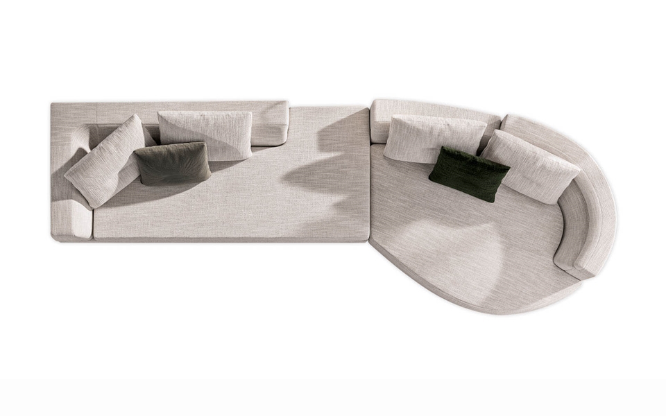 Gracias a los distintos módulos combinables entre sí, se obtienen configuraciones en "L" con una geometría perfecta o versiones rectas que pueden convertirse en perfiles sinuosos gracias a los originales elementos curvos Alexander "Drop", como la chaise longue o los elementos terminales con esquina redondeada.