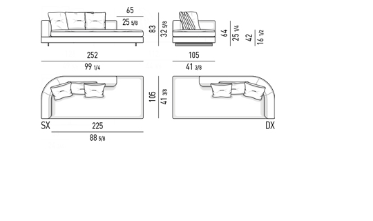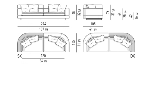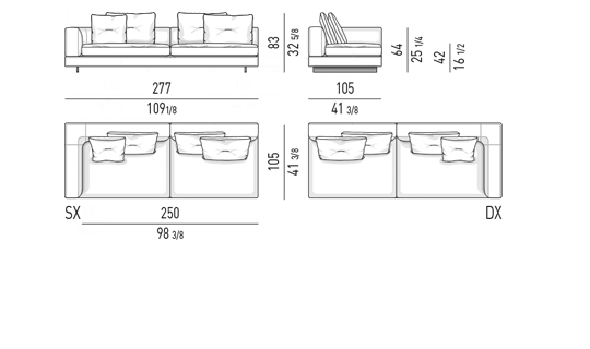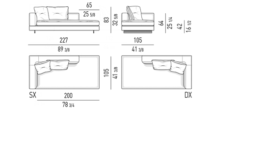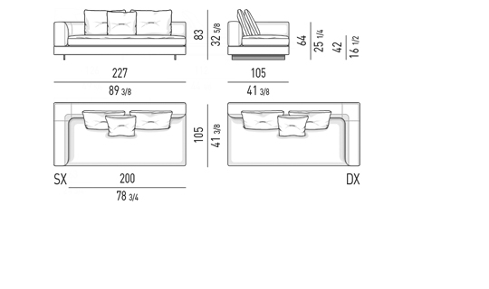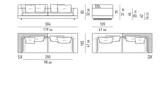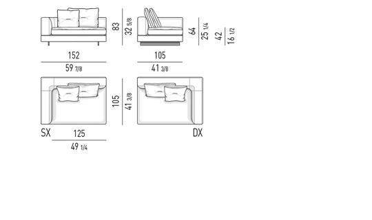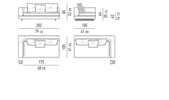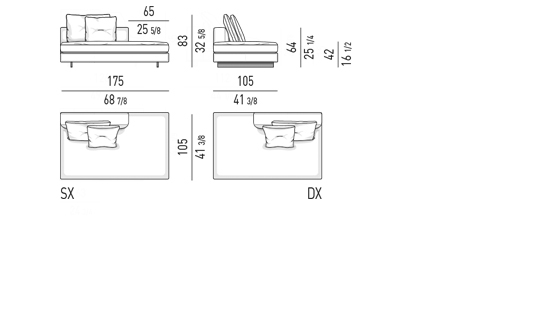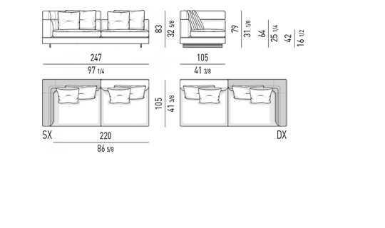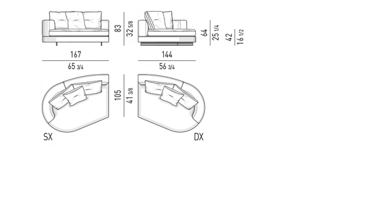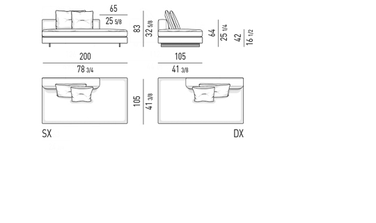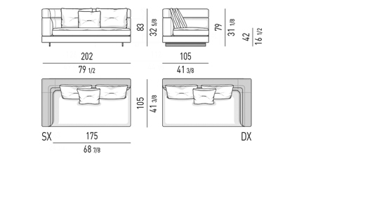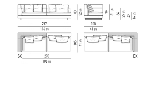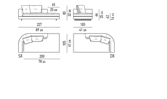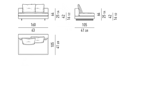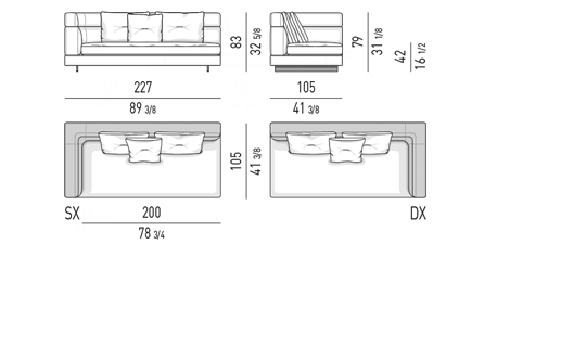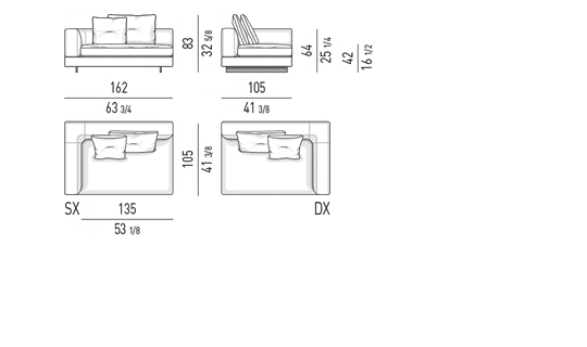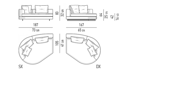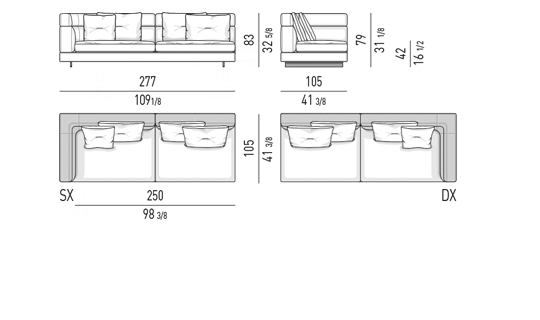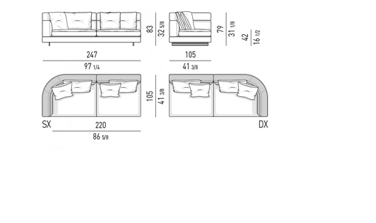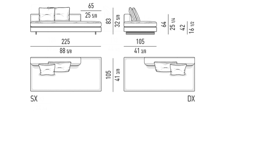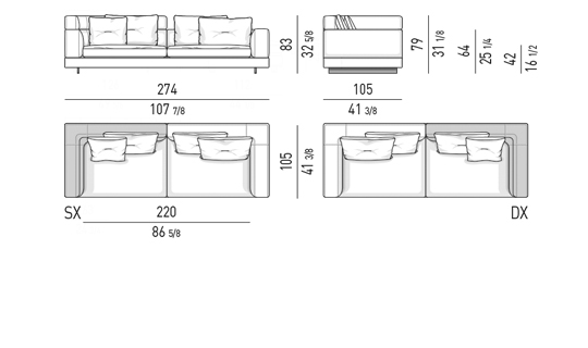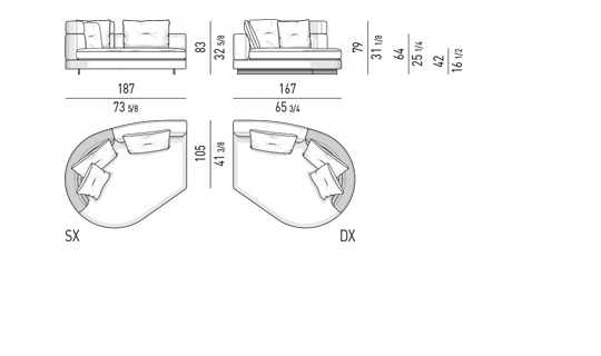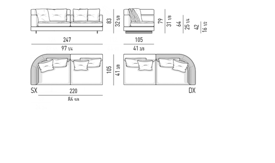 Gracias a los distintos módulos combinables entre sí, se obtienen configuraciones en "L" con una geometría perfecta o versiones rectas que pueden convertirse en perfiles sinuosos gracias a los originales elementos curvos Alexander "Drop", como la chaise longue o los elementos terminales con esquina redondeada.