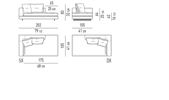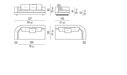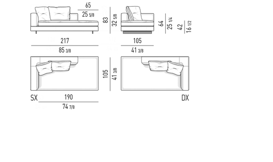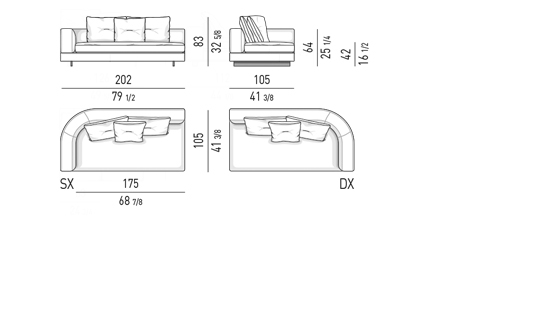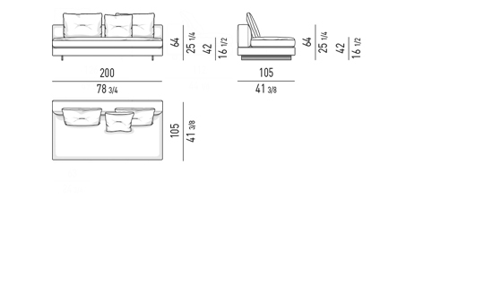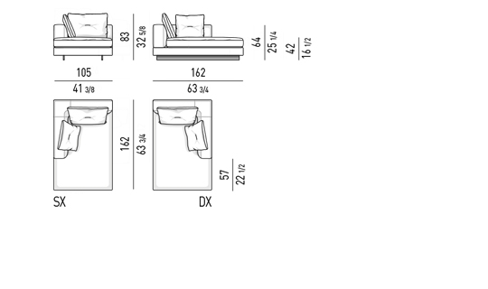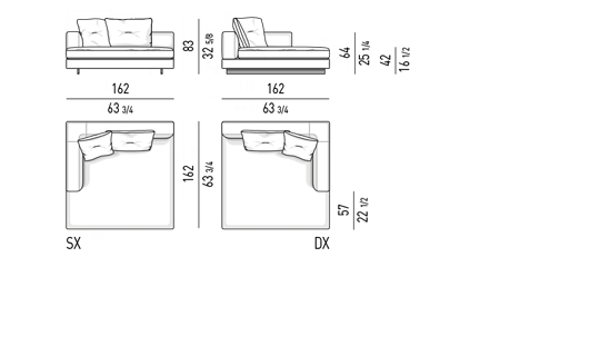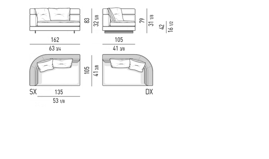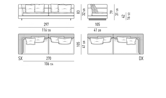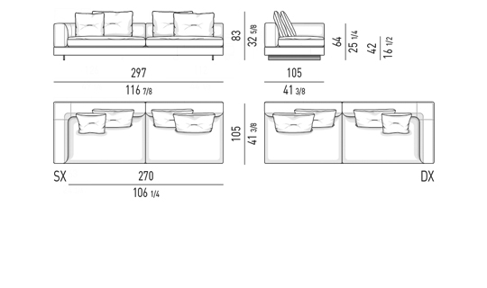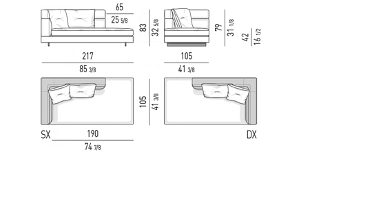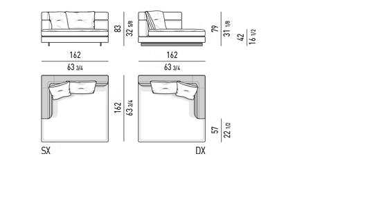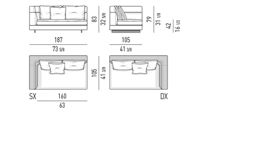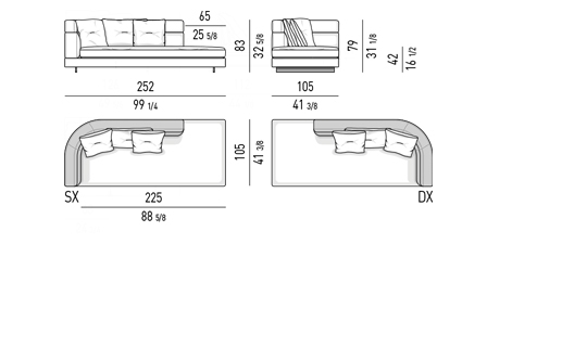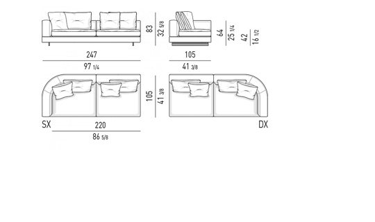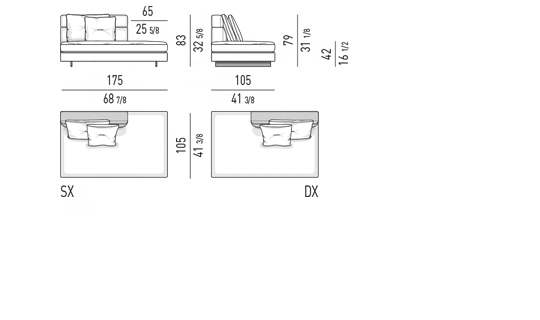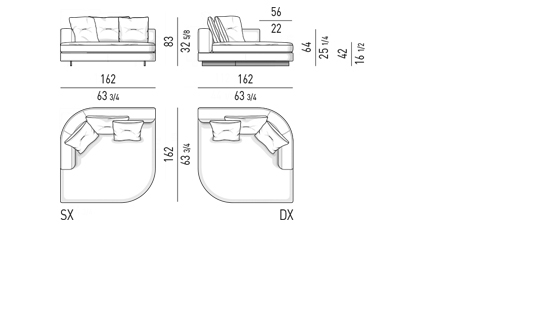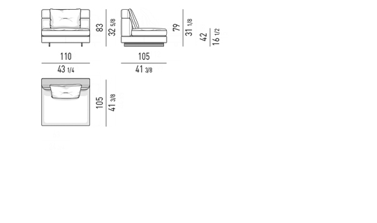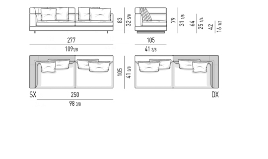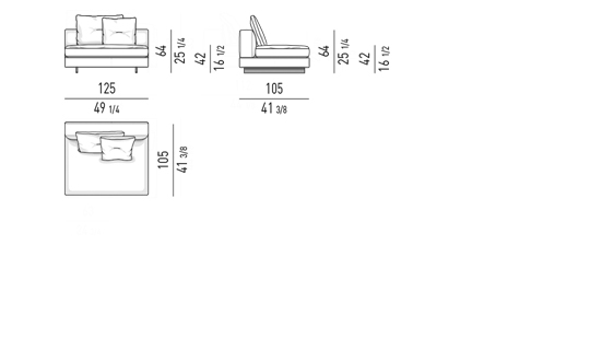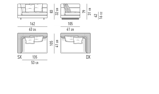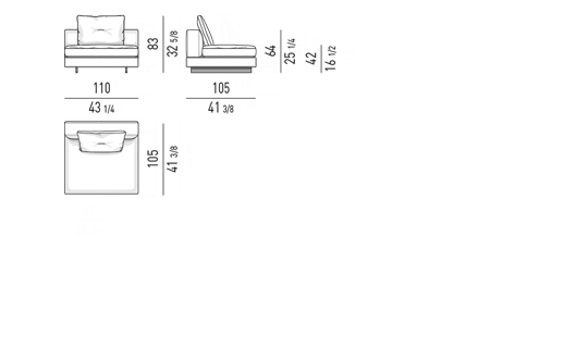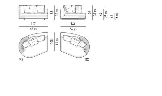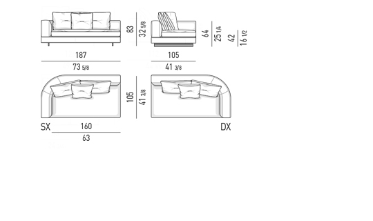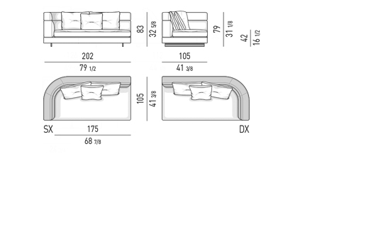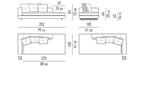 Gracias a los distintos módulos combinables entre sí, se obtienen configuraciones en "L" con una geometría perfecta o versiones rectas que pueden convertirse en perfiles sinuosos gracias a los originales elementos curvos Alexander "Drop", como la chaise longue o los elementos terminales con esquina redondeada.