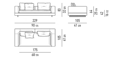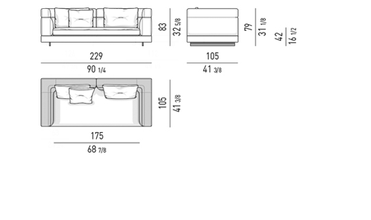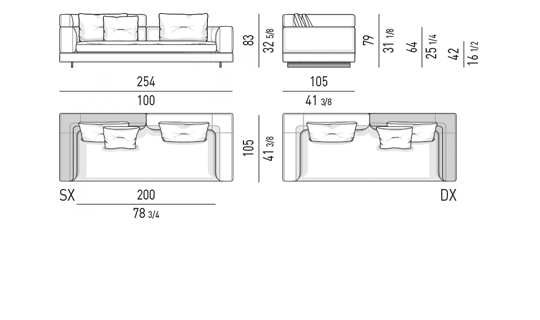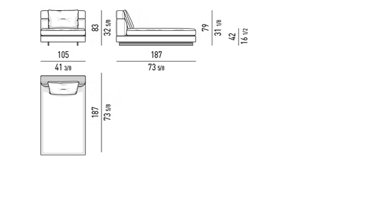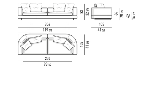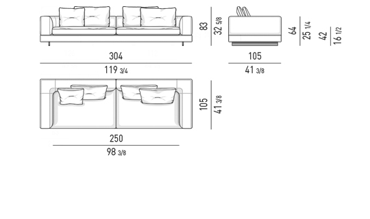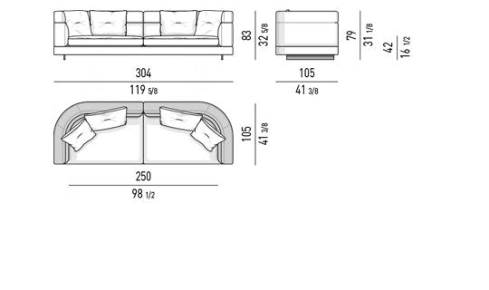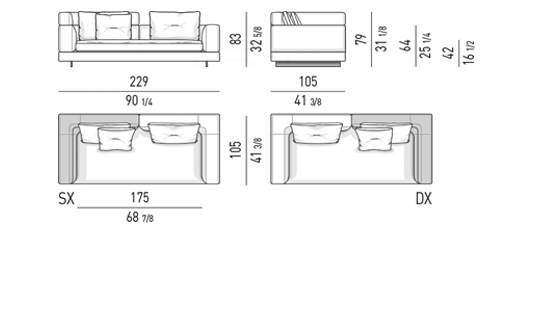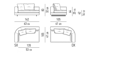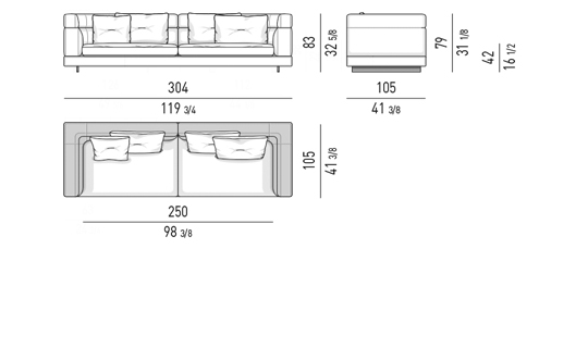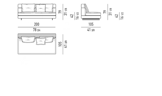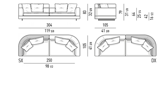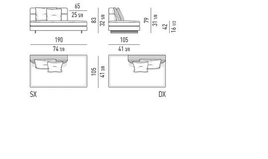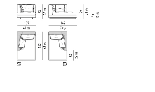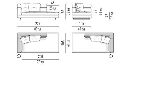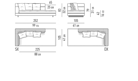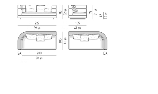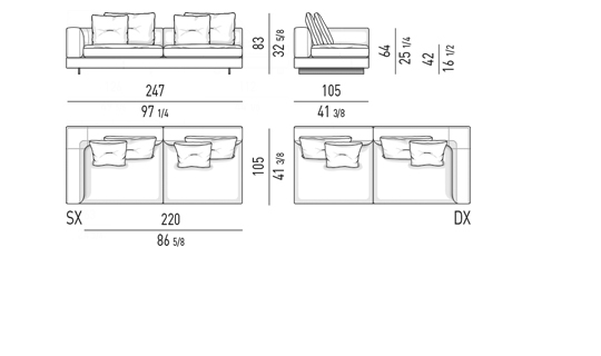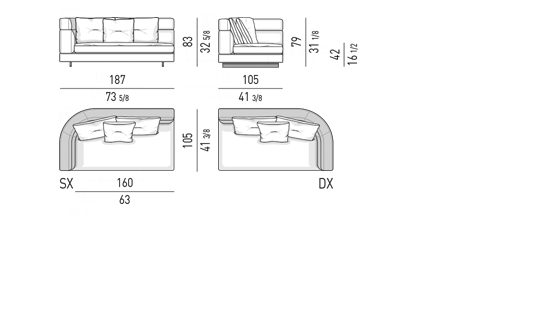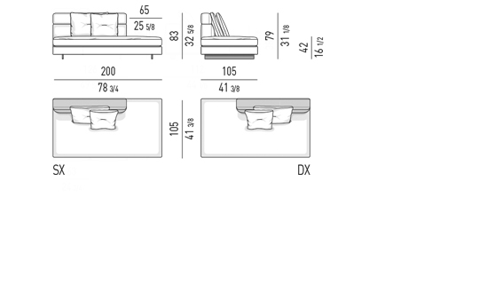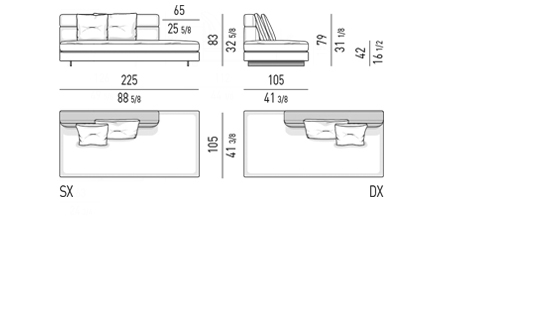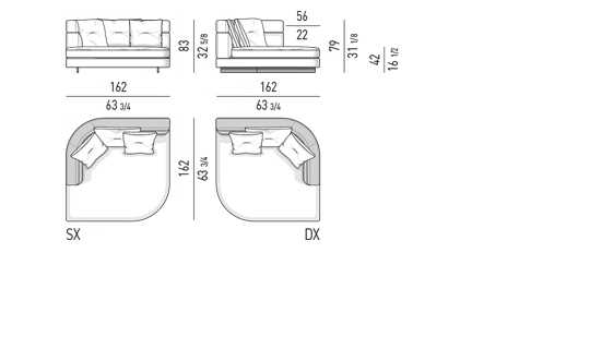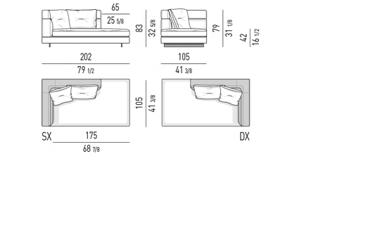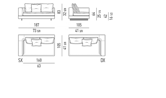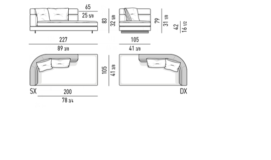 Gracias a los distintos módulos combinables entre sí, se obtienen configuraciones en "L" con una geometría perfecta o versiones rectas que pueden convertirse en perfiles sinuosos gracias a los originales elementos curvos Alexander "Drop", como la chaise longue o los elementos terminales con esquina redondeada.