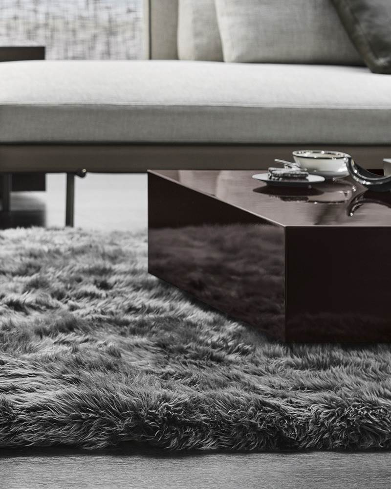 La alfombra es muy duradera y resistente, antiestática y absorbe el sonido. Personalizada en el reverso con un elegante tejido jacquard con el logotipo de Minotti, garantiza una función antideslizante gracias a un tejido técnico de algodón impreso con micropartículas de silicona dispuestas a lo largo de los bordes.