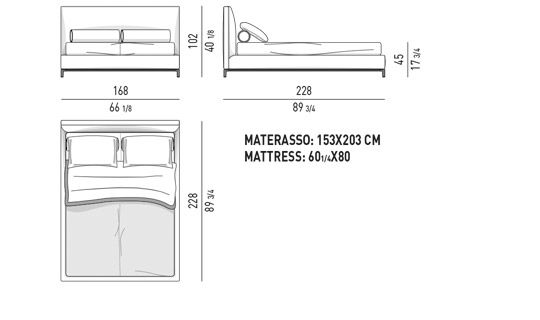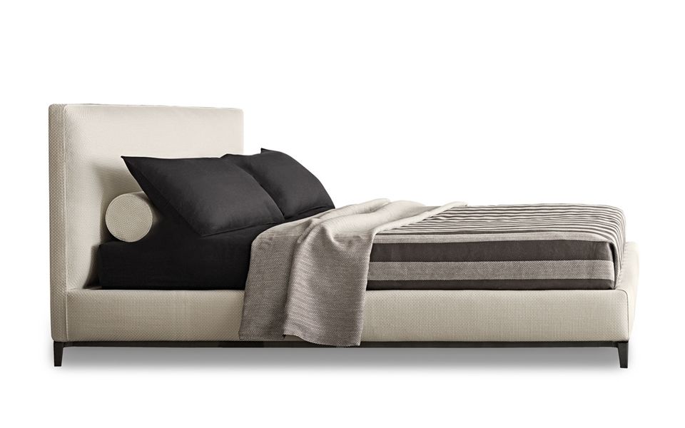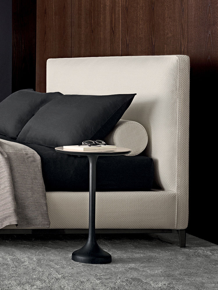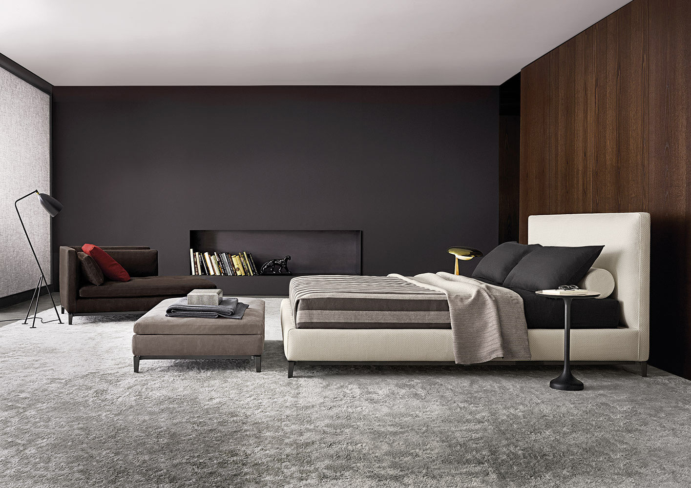 Los contenidos estéticos del sistema de asientos Andersen también están presentes en la cama homónima, caracterizada por sus volúmenes equilibrados y por su base elevada del suelo mediante elegantes patas barnizadas en color Peltre.