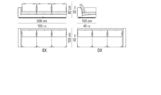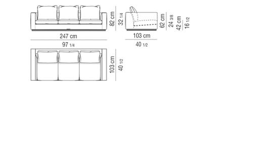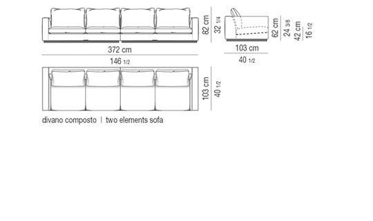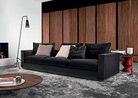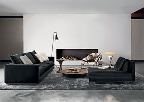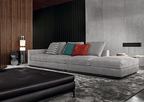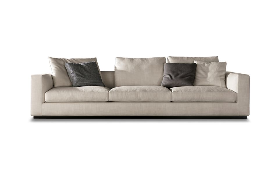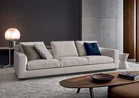 Una base de suelo entrante respecto al perímetro del tablero mantiene el sofá Andersen Line ligeramente elevado del suelo, confiriéndole una línea limpia y esencial que acentúa su carácter riguroso y transversal y le permite vestir con la misma desenvoltura todos los tejidos de la exclusiva colección Minotti e integrarse con comedida elegancia en cualquier ambiente, en combinación con todos los productos de la colección.