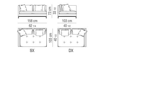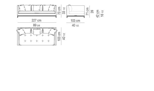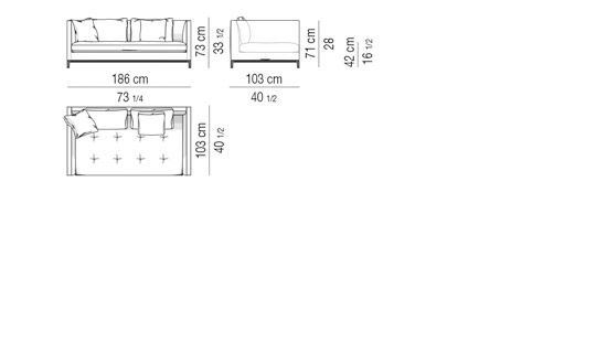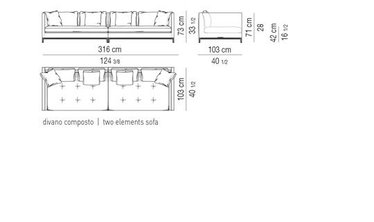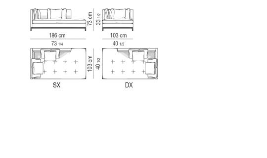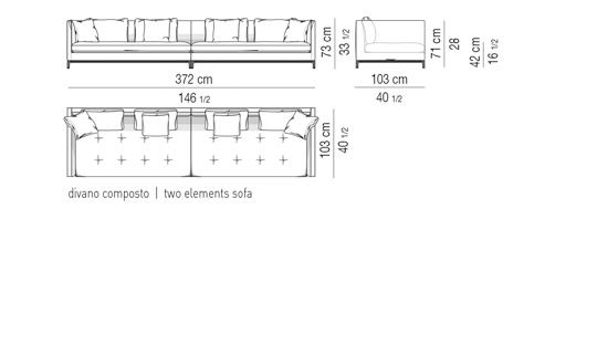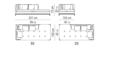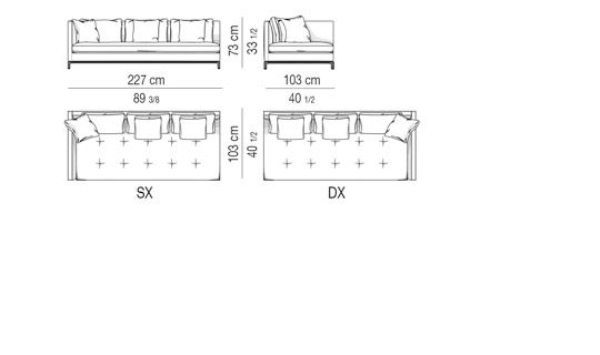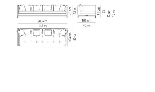 Thick seat cushion padding in channeled goose down, for increased cushion softness. Resilient polyurethane foam insert, covered - in the upper part - with “thermosensitive” polyurethane material. Backrest cushions fully padded with channeled goose down. Armrests and backrest frame covered on internal side with quilted channeled goose down, which results in enhanced softness, thereby making the armrests look like cushions.