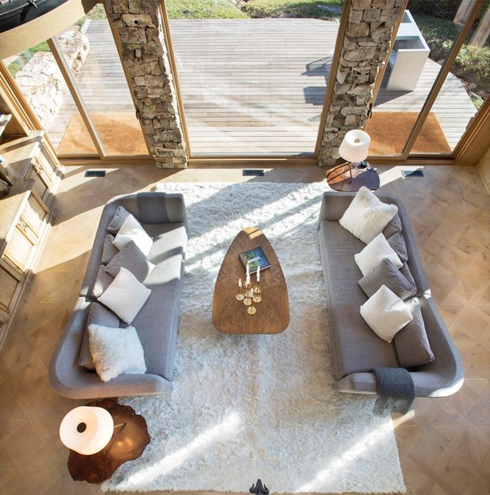 El centro neurálgico de la casa es sin duda la zona del salón, amueblada con dos composiciones del sistema de asientos Seymour colocadas en el centro del ambiente. Las formas suaves y sinuosas de los sofás confieren un aire relajado y acogedor al espacio y dialogan perfectamente con los complementos y los accesorios que completan el ambiente, sugiriendo una atmósfera de cálida e informal elegancia.