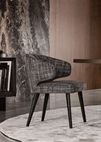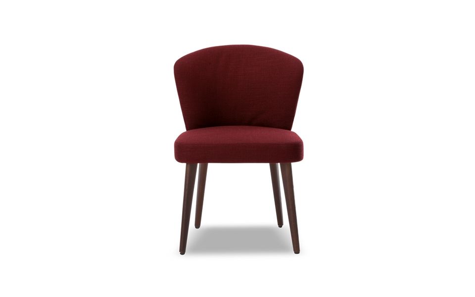 Aston "Dining" es una silla de formas envolventes que aúna elegancia formal y confort. Su estructura, provista de un suave relleno, apoya sobre patas ahusadas de madera maciza de Fresno teñido Tabaco con poro abierto o lacado Moka con poro abierto.