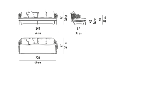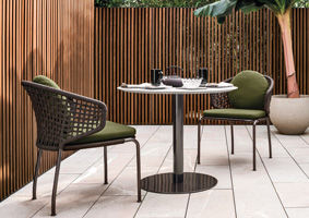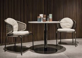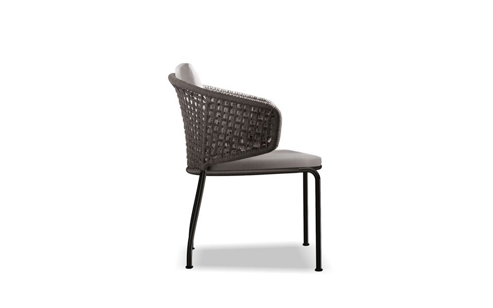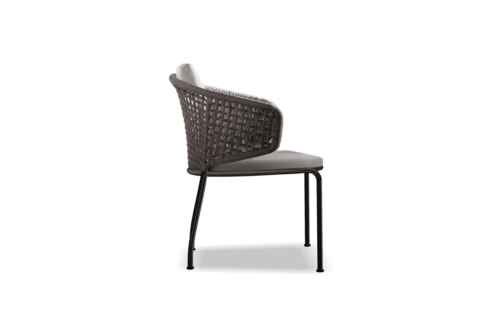 La colección Aston "Cord" Outdoor cuenta con una estructura de acero inoxidable barnizado poliéster color Peltre específicamente tratado para ambientes exteriores y rellenos revestidos con tejido impermeable.