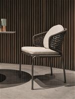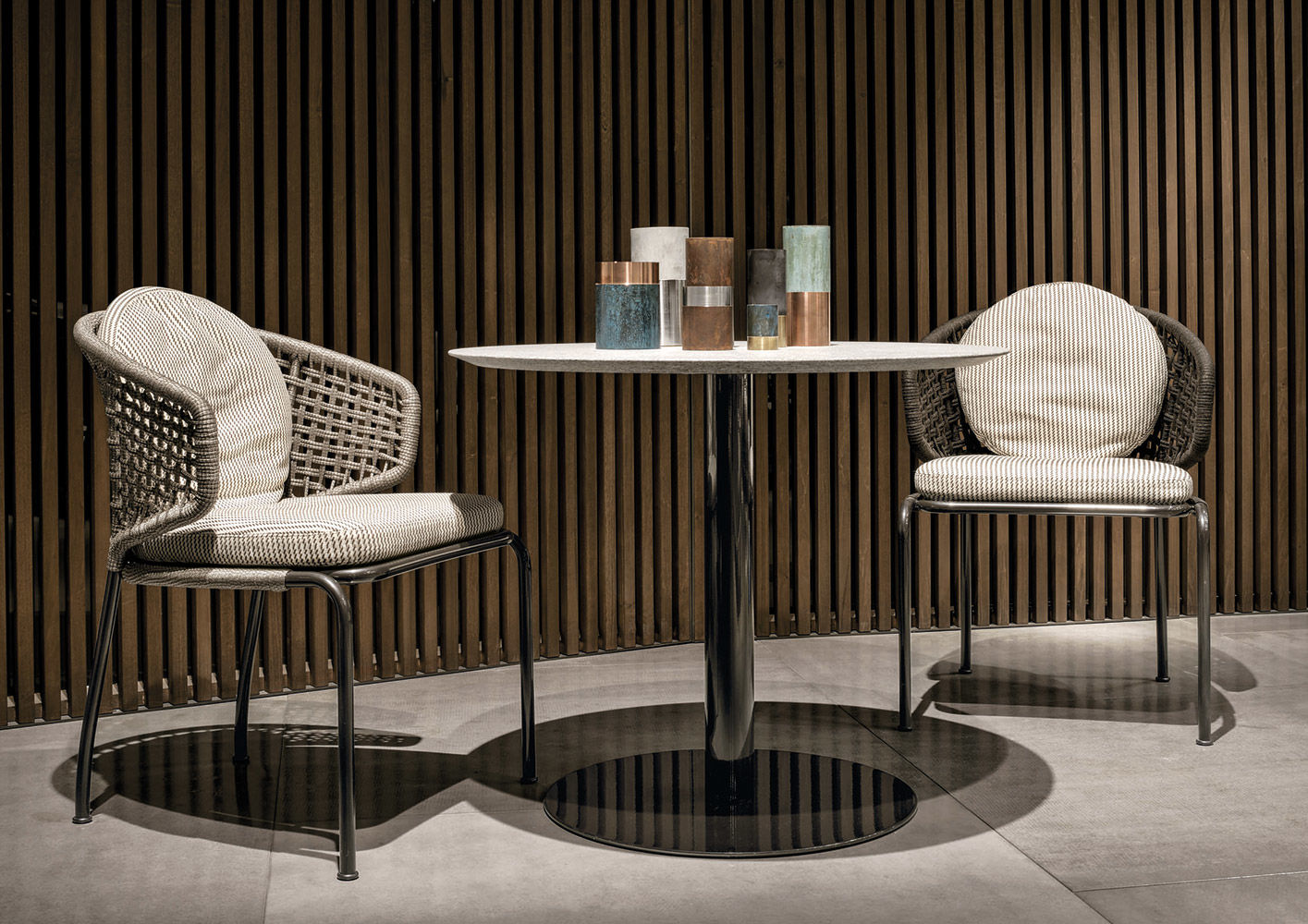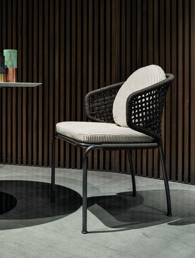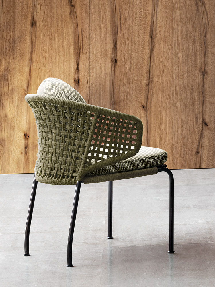 El respaldo, recubierto con un hilado de polipropileno trenzado, se presenta en una amplia gama cromática que armoniza perfectamente con los tejidos de la colección Art Lifescape: gris claro y marrón oscuro para el hilado de 7 mm de diámetro, Sand, Sunflower, Verde Khaki y Ruggine para la trama con diámetro de 8 mm.