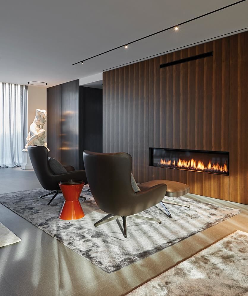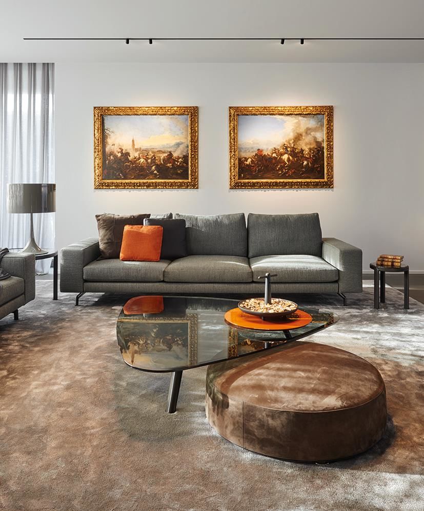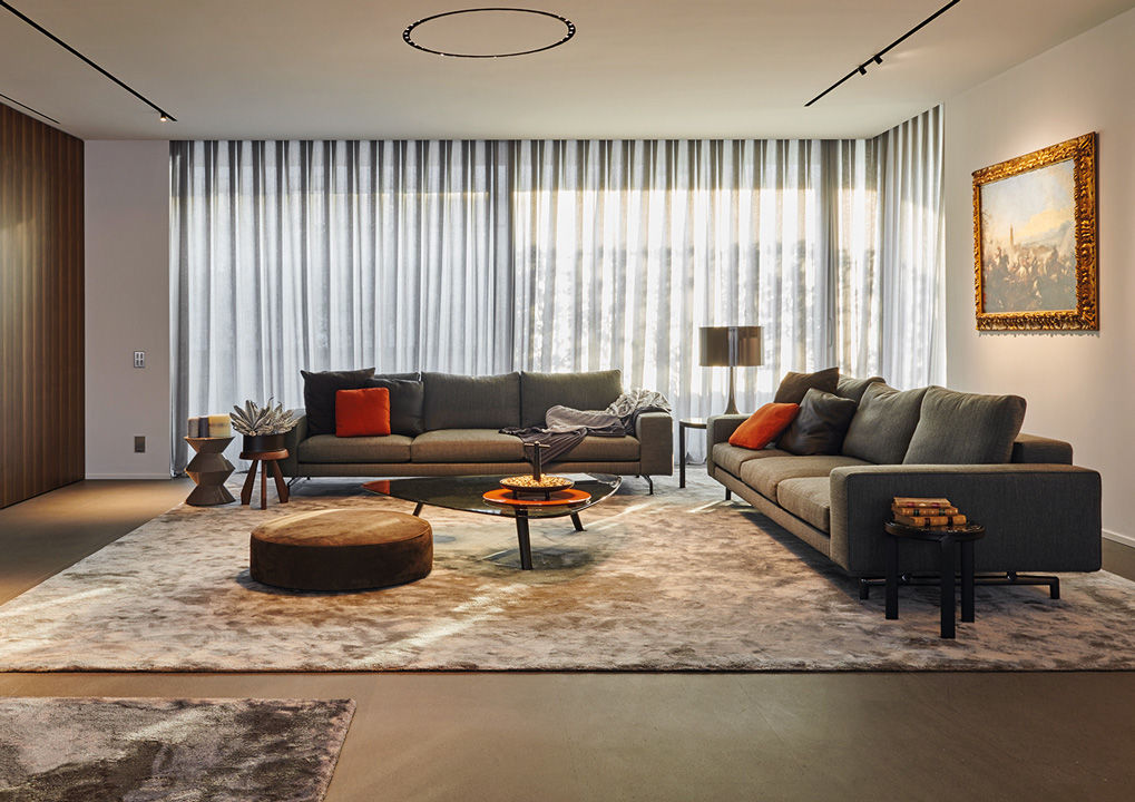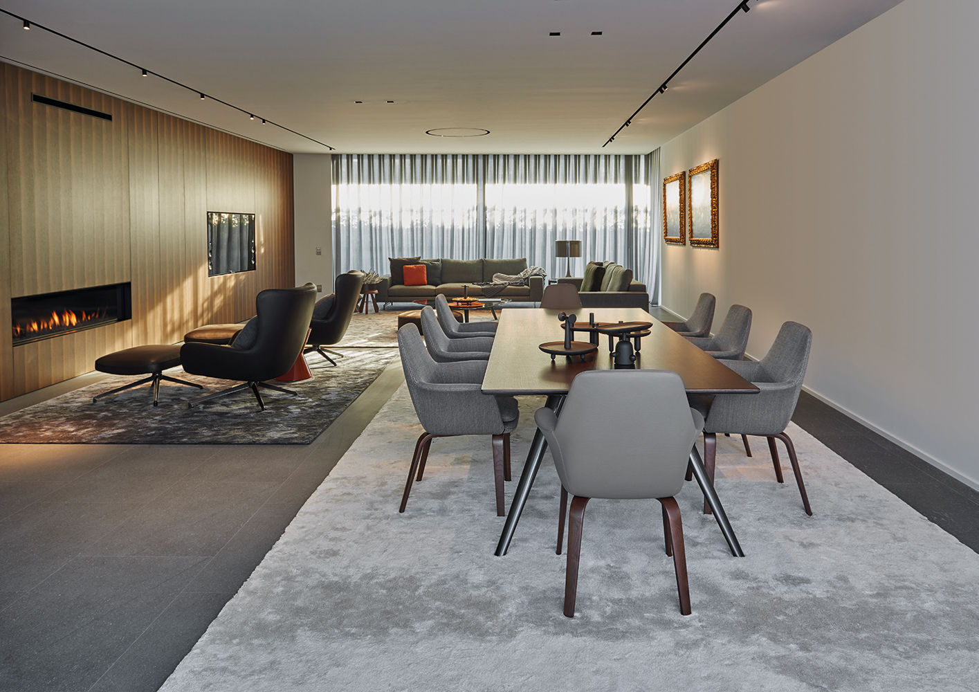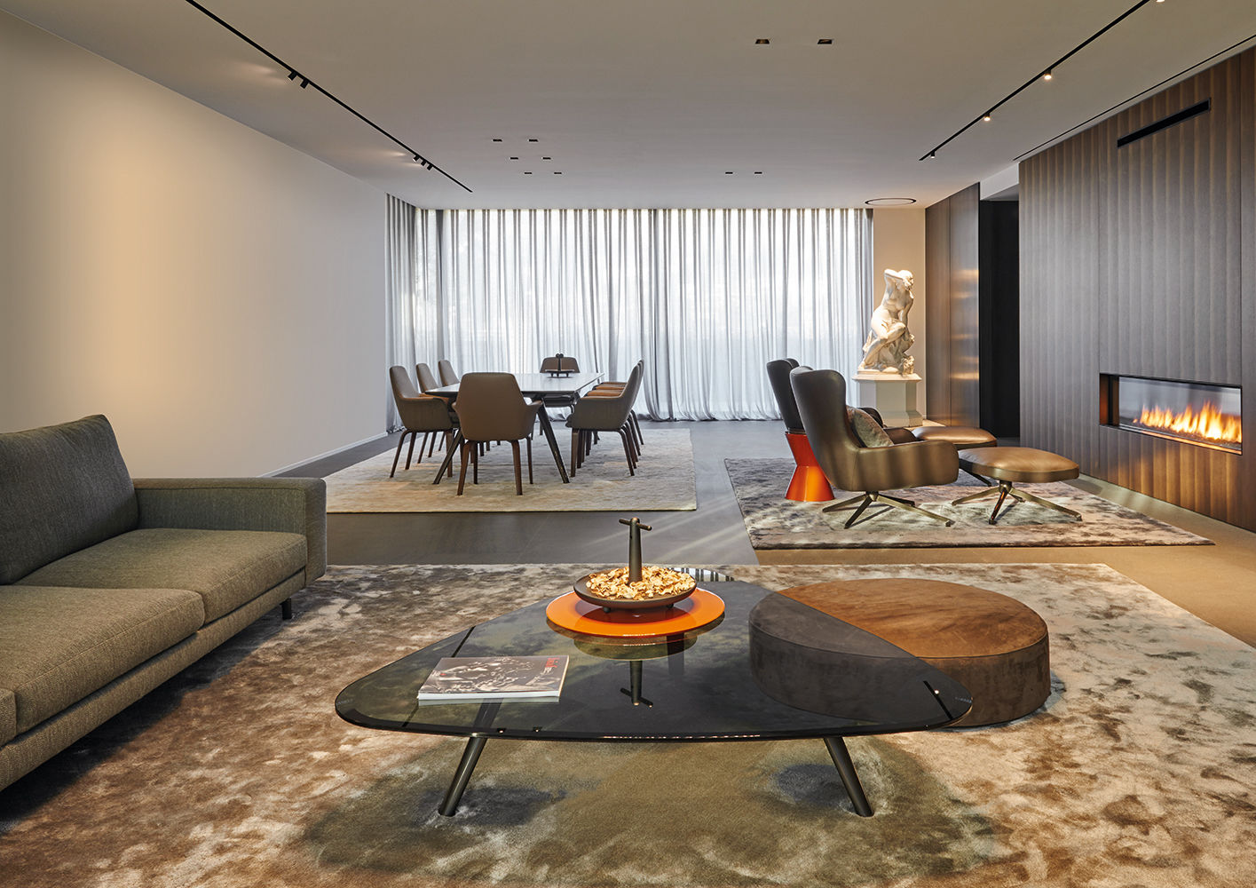 Para la sala de estar se han elegido sofás Sherman revestidos en un refinado tejido de color gris, combinados con mesitas Sullivan, Riley y Cesar. Enfrente de la chimenea se han colocado dos sillones Jensen con reposapiés revestidos en suave piel de color beige y una mesita Cesar lacada brillante en color óxido.