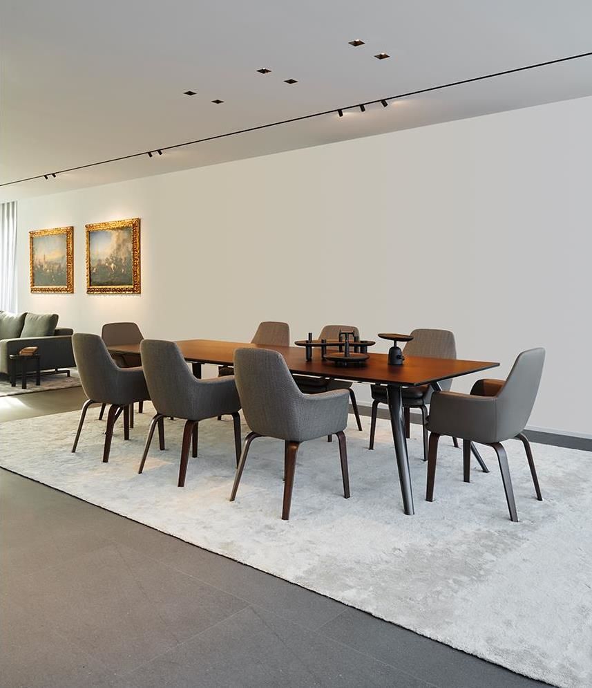 En la zona del comedor encontramos una mesa Evans con tablero de roble teñido tabaco con butacas York.