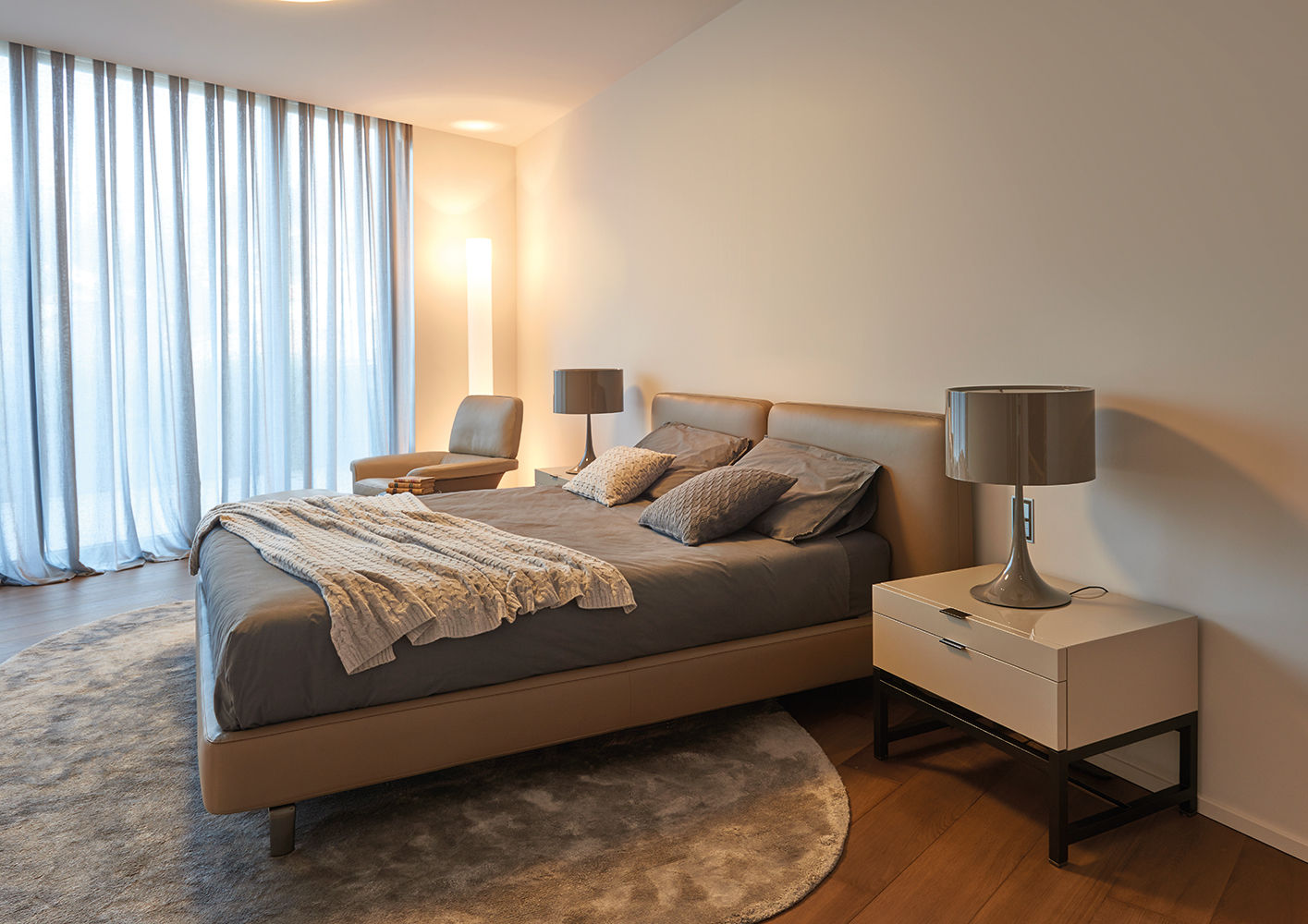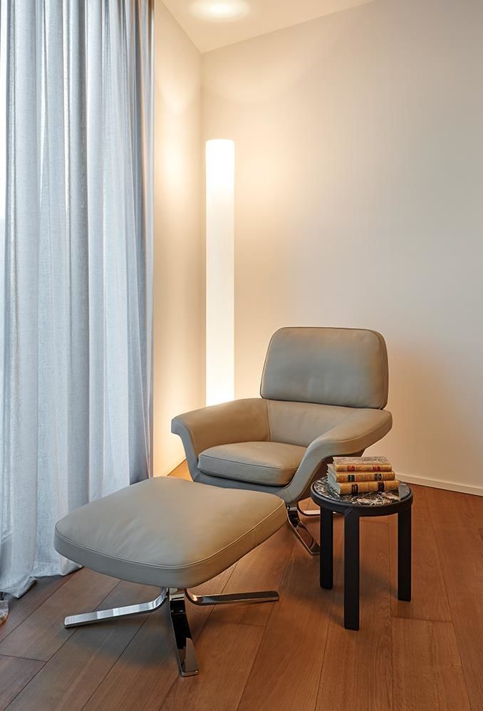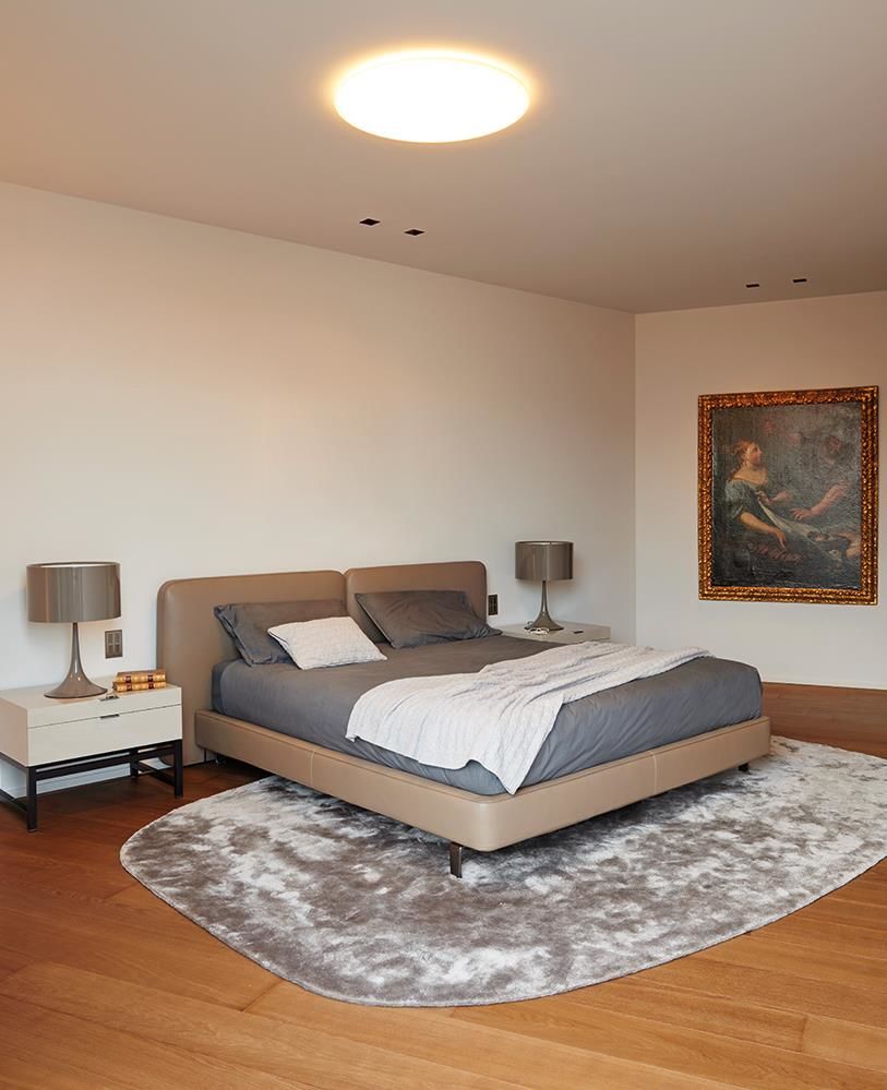 El dormitorio ha sido amueblado con una cama Tatlin revestida en suave piel Aspen de color beige, como el sillón Blake-Soft, mientras que las mesitas de noche son del modelo Harvey. Todos los ambientes están completados con alfombras de la serie Dibbets