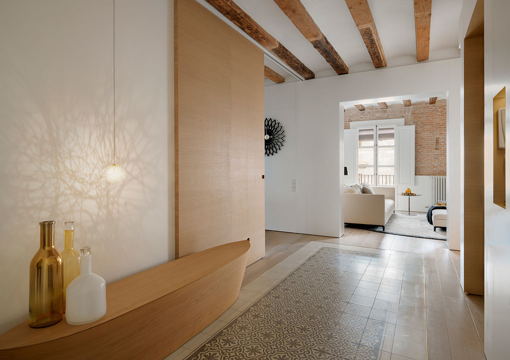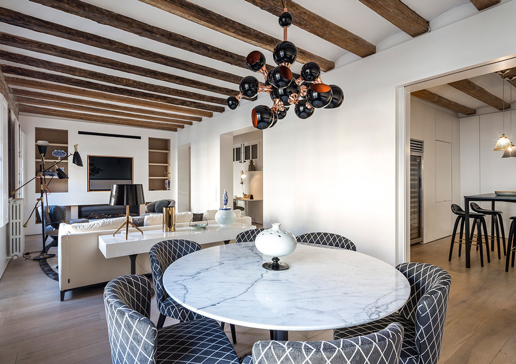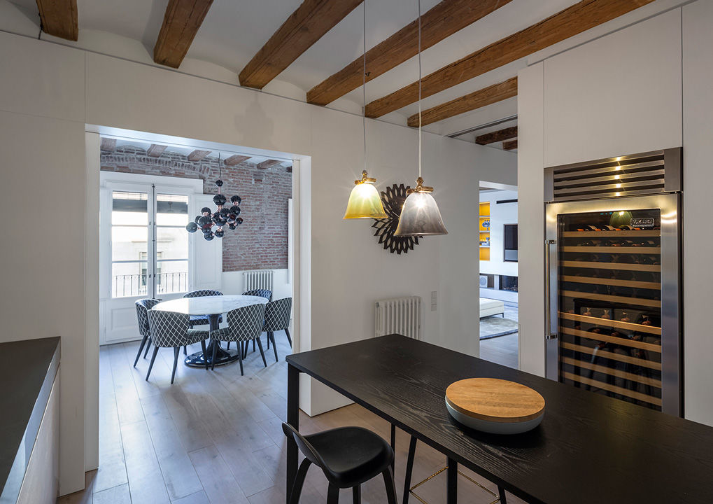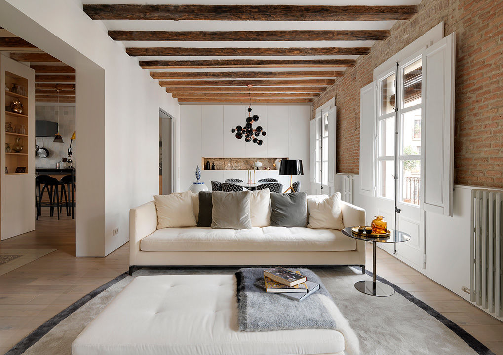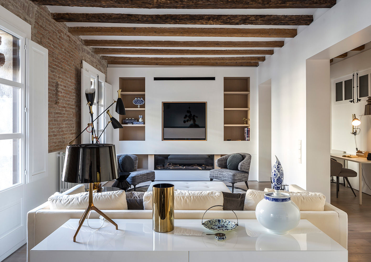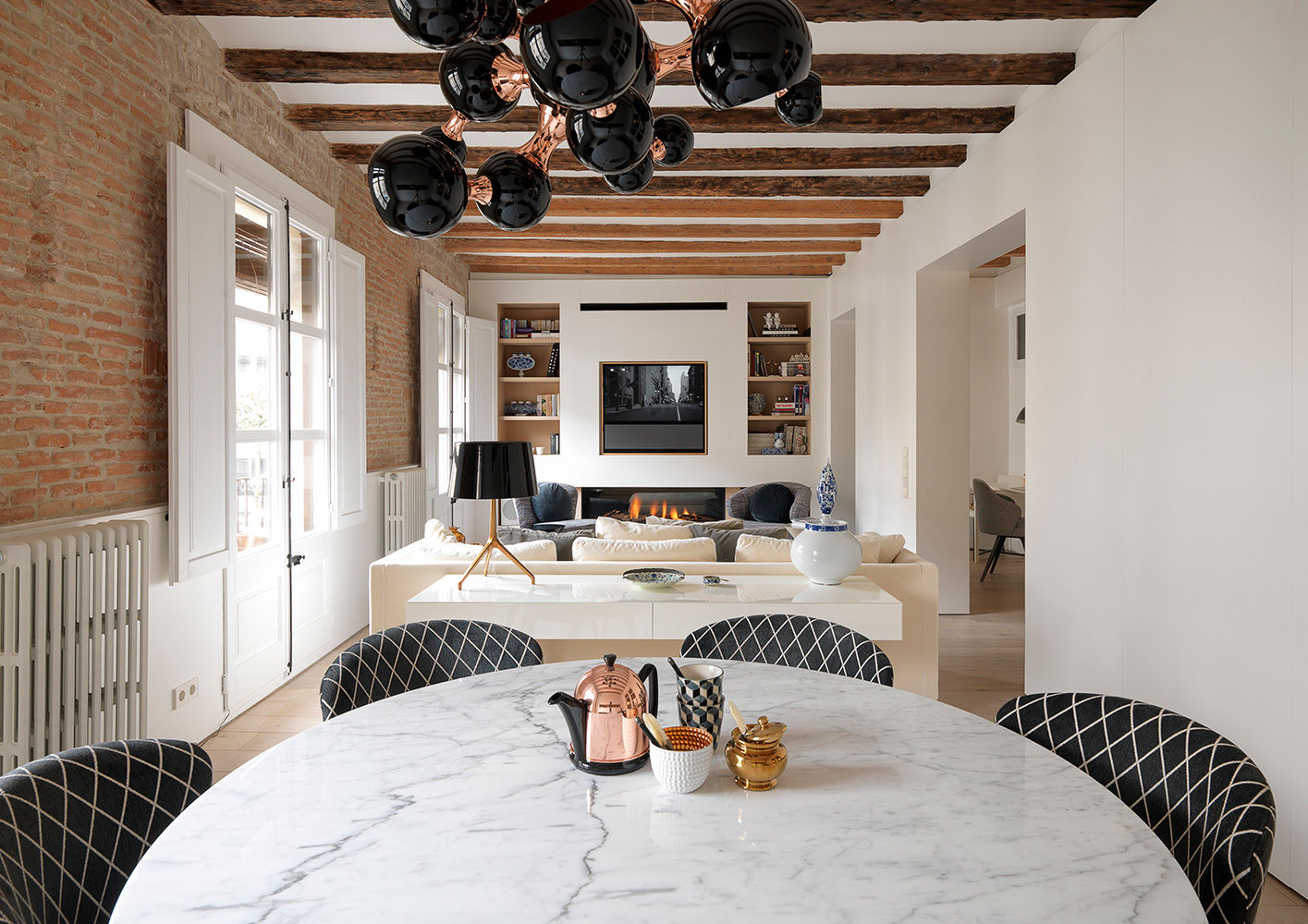 Un elegante apartamento ubicado en la antigua Plaza San Miguel, en el Barrio Gótico, corazón de la Barcelona medieval. Las calles de este barrio generalmente son angostas y oscuras. Sin embargo, este edificio goza de una envidiable posición, y el apartamento, situado en el cuarto piso, tiene una excelente exposición a la luz. Anke Summerhill, propietaria, junto a su marido John, de Minotti London y artífice del proyecto de diseño de interiores, optó por una reforma que permitiera realizar espacios abiertos y comunicantes entre sí, y decidió valorizar materiales originales como los ladrillos y las vigas a la vista. Para amueblar el espacio living con vista a la plaza se eligieron un sofá Andersen Slim revestido en tejido crudo, combinado con el puf homónimo y sillones Aston revestidos en tejido Macro Melange. La mesa de comedor Neto tiene tablero de mármol, mientras que las butacas Aston están revestidas en tejido Ohara, caracterizado por un refinado motivo de rombos.