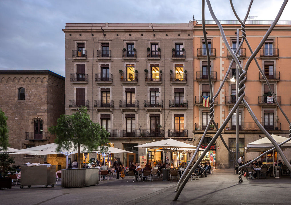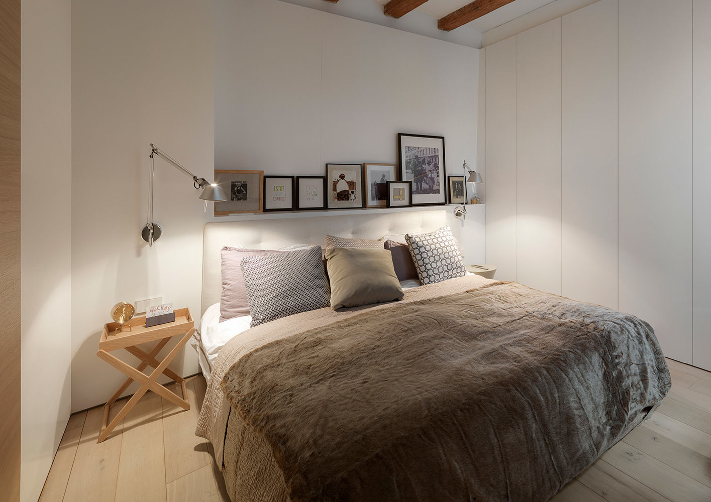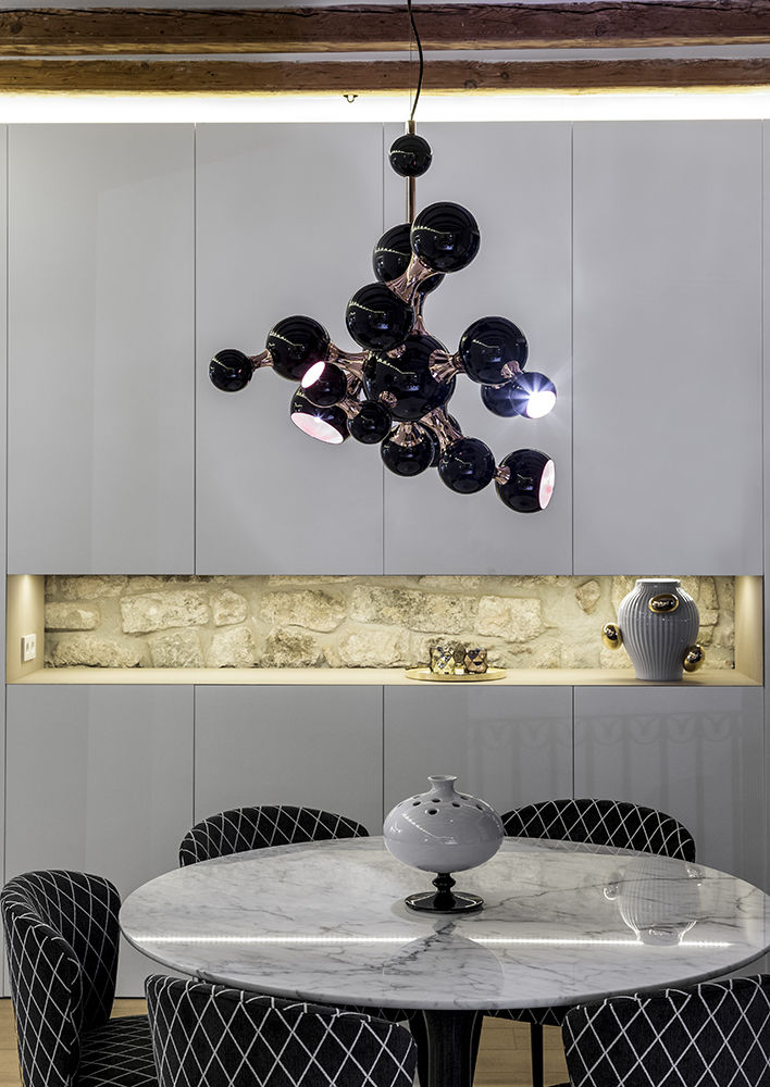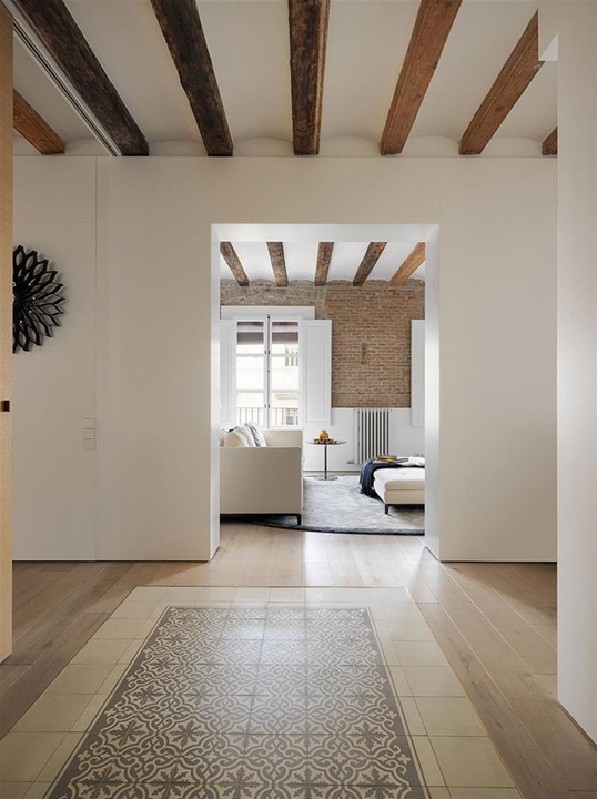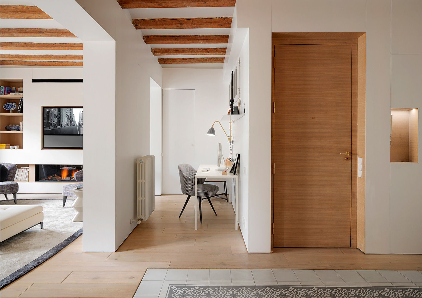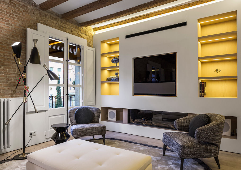 Un elegante apartamento ubicado en la antigua Plaza San Miguel, en el Barrio Gótico, corazón de la Barcelona medieval. Las calles de este barrio generalmente son angostas y oscuras. Sin embargo, este edificio goza de una envidiable posición, y el apartamento, situado en el cuarto piso, tiene una excelente exposición a la luz. Anke Summerhill, propietaria, junto a su marido John, de Minotti London y artífice del proyecto de diseño de interiores, optó por una reforma que permitiera realizar espacios abiertos y comunicantes entre sí, y decidió valorizar materiales originales como los ladrillos y las vigas a la vista. Para amueblar el espacio living con vista a la plaza se eligieron un sofá Andersen Slim revestido en tejido crudo, combinado con el puf homónimo y sillones Aston revestidos en tejido Macro Melange. La mesa de comedor Neto tiene tablero de mármol, mientras que las butacas Aston están revestidas en tejido Ohara, caracterizado por un refinado motivo de rombos.