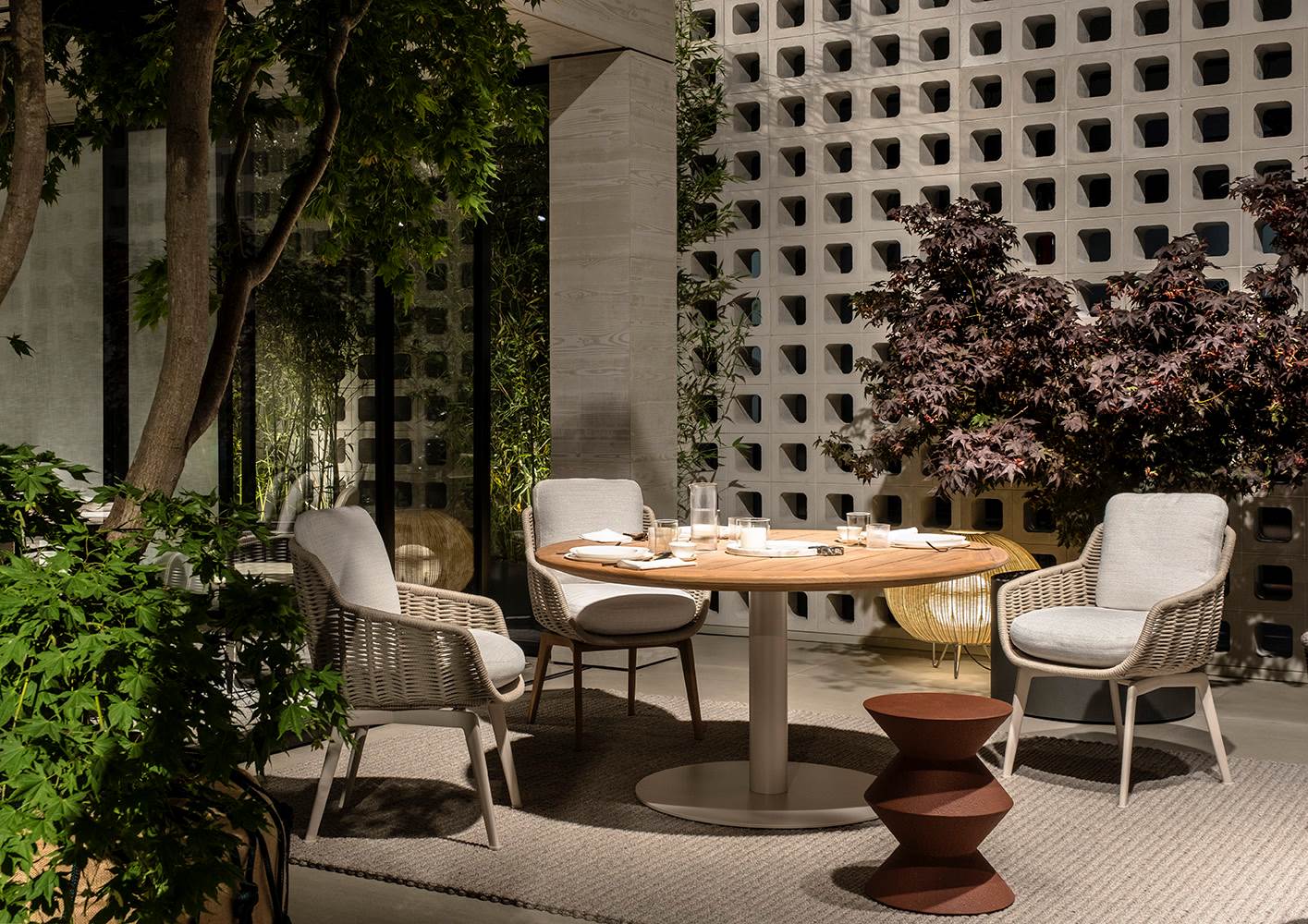 Los asientos descansan sobre una base de aluminio barnizado mate, en tonos Crudo y Testa di Moro en continuidad cromática con los colores de las cuerdas, y cuentan con cojines acolchados caracterizados por interiores de espuma de poliuretano de alta resistencia, recubiertos de fibra y tejido hidrófugo.
