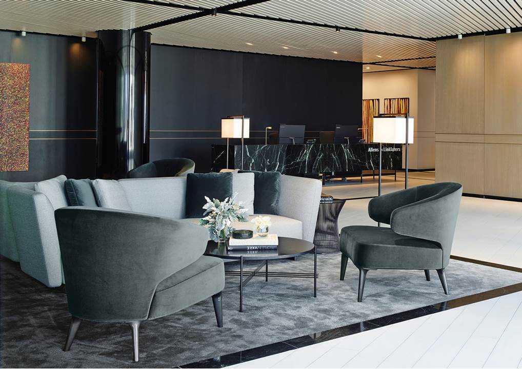El contraste armónico de materiales y colores, que oscilan entre tonalidades cálidas y frías, claras y oscuras, hablan de las distintas facetas de la actividad de Allens Linklaters y son el telón de fondo ideal para su amplia colección de arte.