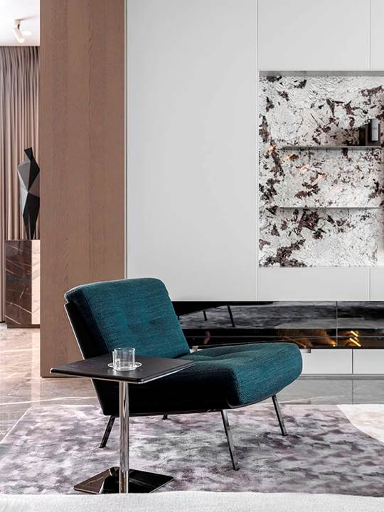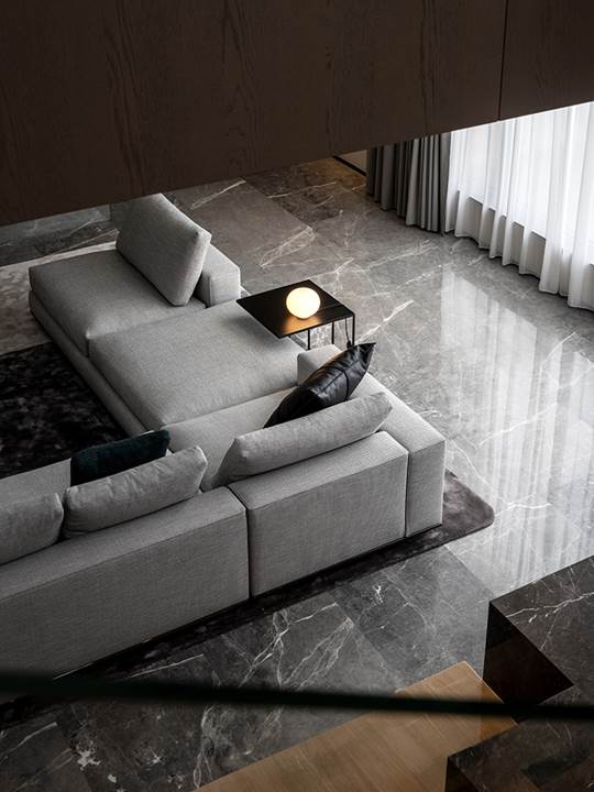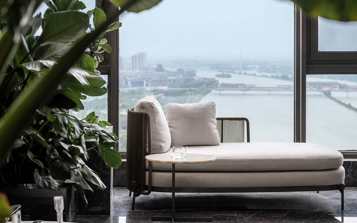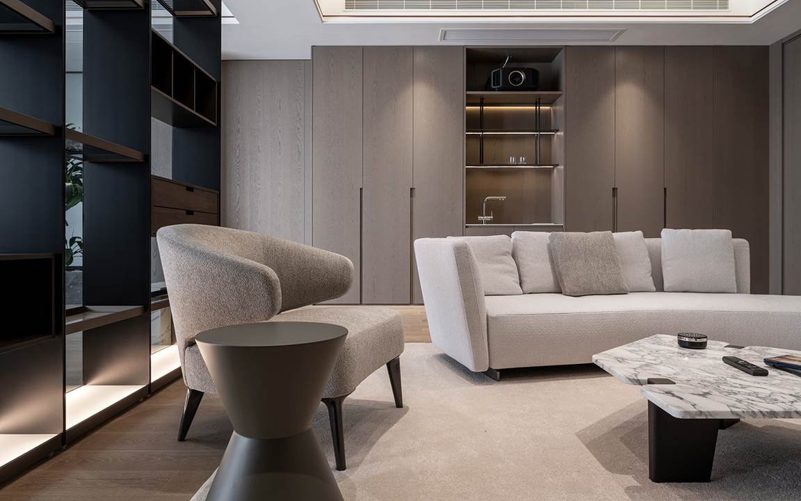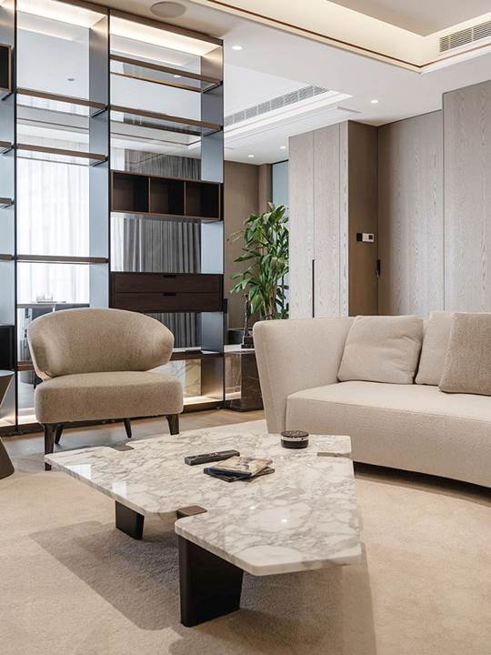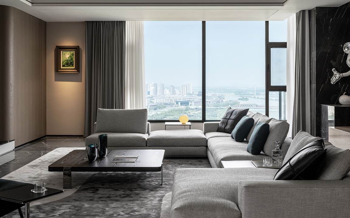 Todo está diseñado para disfrutar de las vistas y la luz de los grandes ventanales que se extienden del suelo hasta el techo y que dan a las orillas del río Wei. La permeabilidad de la mirada también se respeta con la presencia de librerías de doble cara que se convierten en telones de fondo capaces de difundir la luz natural incluso en espacios que, de lo contrario, serían oscuros, como en el caso de la zona de estudio y TV caracterizada por el sillón Aston, cuya suave comodidad se prolonga en el tramo semicurvo del sofá Lounge Seymour.