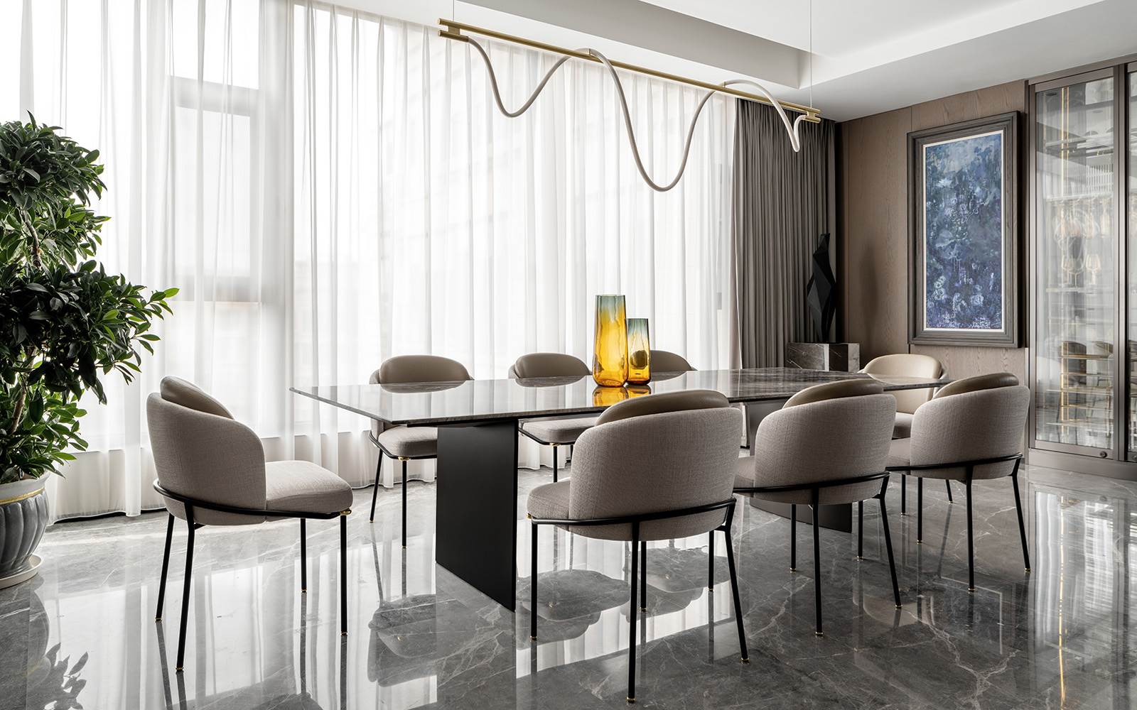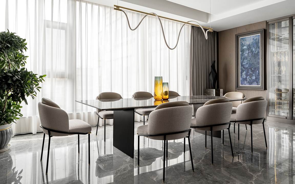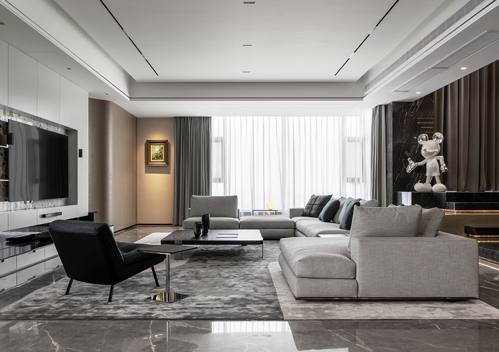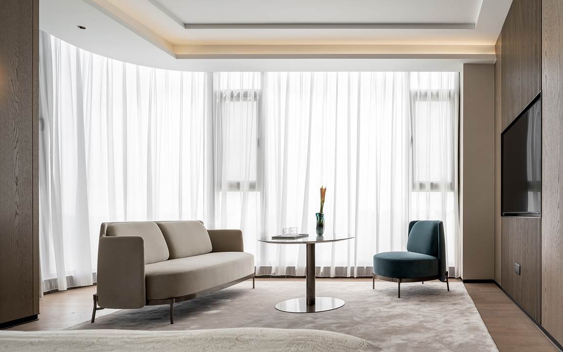 Todo está diseñado para disfrutar de las vistas y la luz de los grandes ventanales que se extienden del suelo hasta el techo y que dan a las orillas del río Wei. La permeabilidad de la mirada también se respeta con la presencia de librerías de doble cara que se convierten en telones de fondo capaces de difundir la luz natural incluso en espacios que, de lo contrario, serían oscuros, como en el caso de la zona de estudio y TV caracterizada por el sillón Aston, cuya suave comodidad se prolonga en el tramo semicurvo del sofá Lounge Seymour.