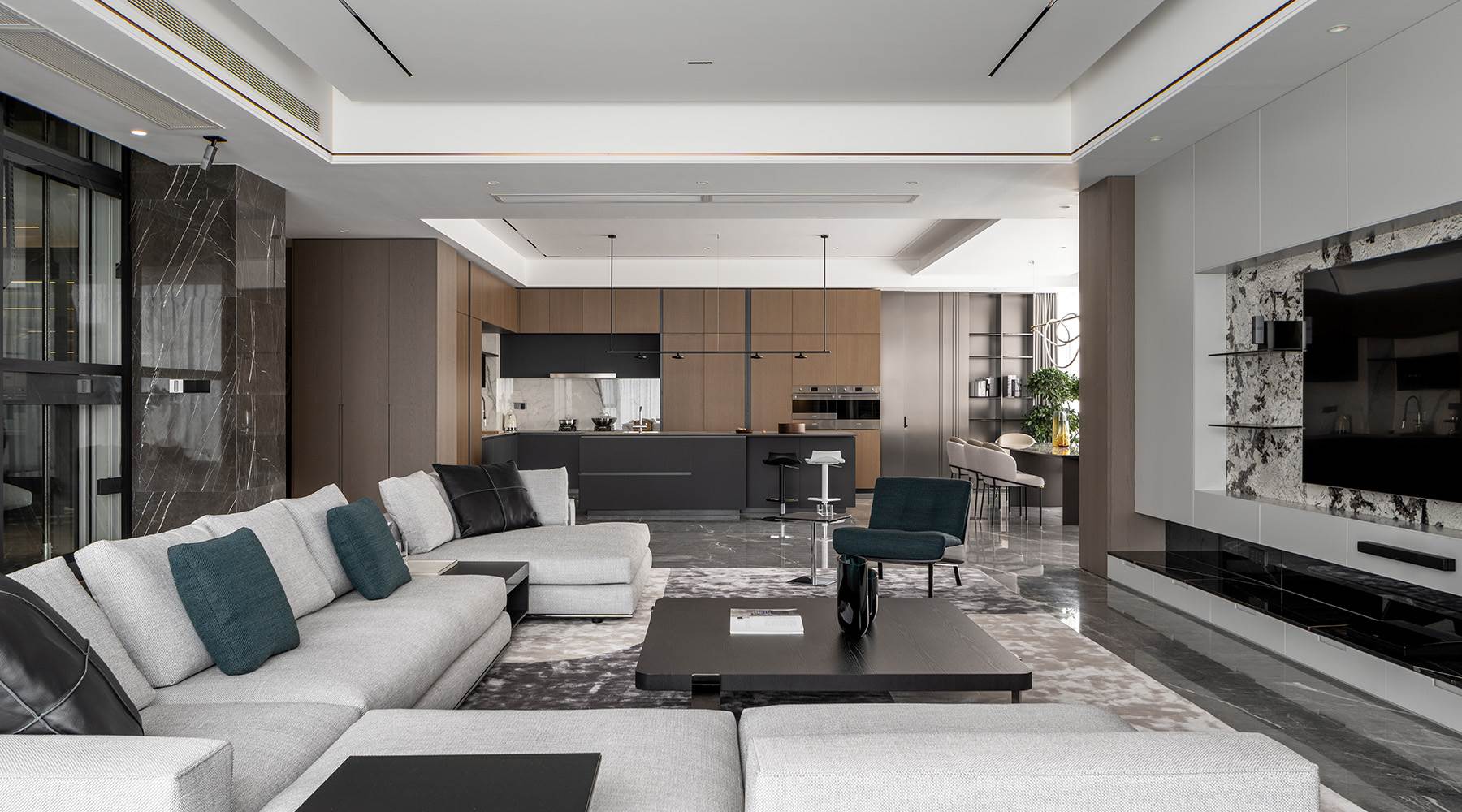El salón se ha diseñado como un lugar único destinado a generar una coexistencia entre la vida formal y familiar del propietario, donde los límites entre las zonas de comedor, salón y cocina se disuelven y son los muebles los que dan ritmo a las diferentes funciones de los espacios.