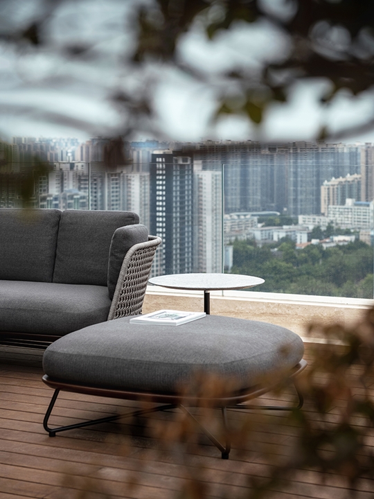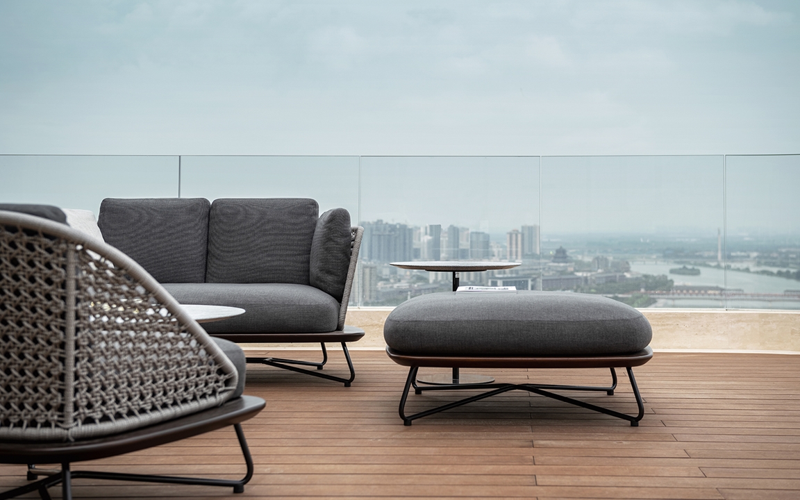 El espacio exterior está amueblado con una selección de asientos del sistema Rivera de Rodolfo Dordoni, acompañados por el sofá Tape Cord Outdoor diseñado por Nendo y complementados por la presencia de las mesas de centro Bellagio Outdoor de Gordon Guillaumier.
