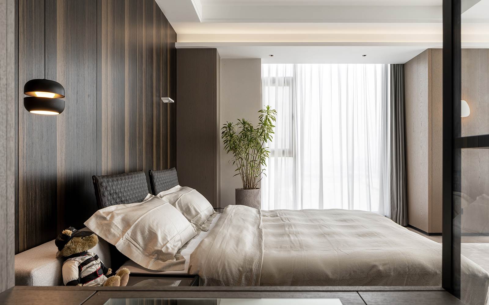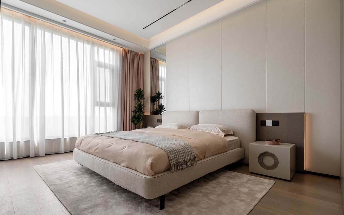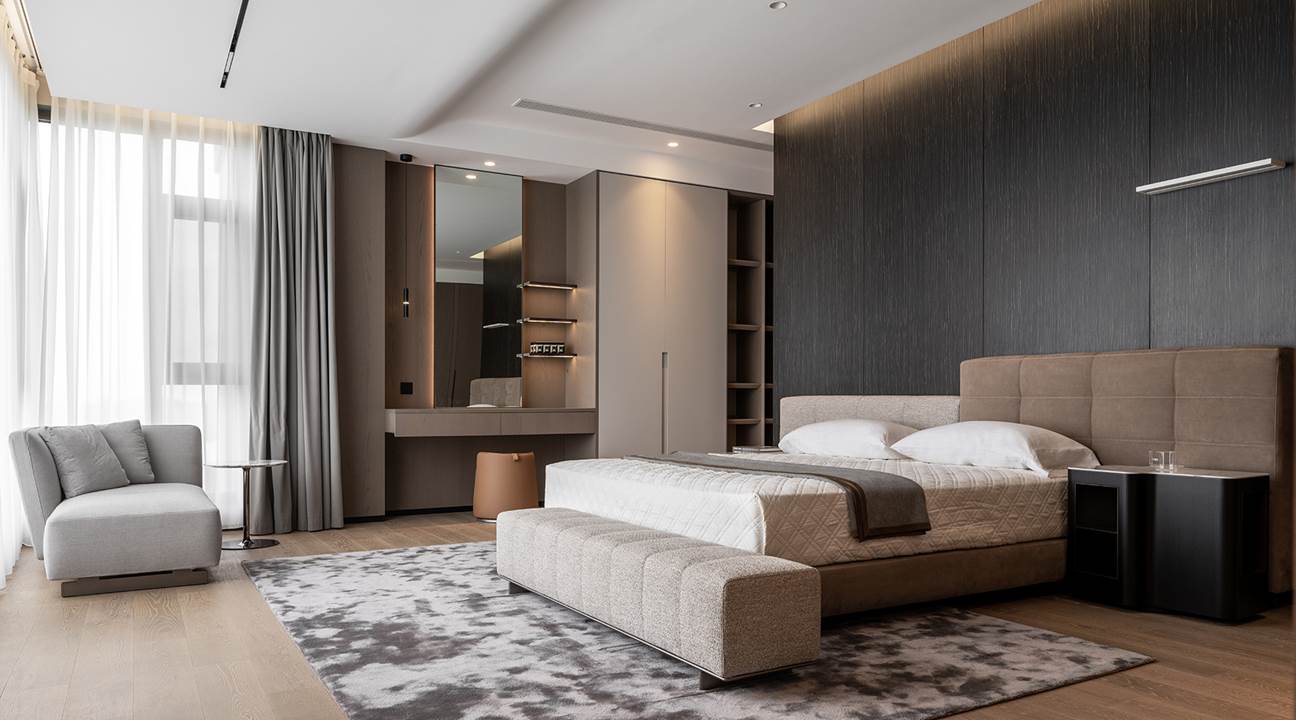 En la segunda planta, el dormitorio principal tiene una ventana esquinera que enfatiza la superficie de la habitación, ya que perceptiblemente parece no tener límites: la materialidad se retoma en la superposición táctil de los elementos de mobiliario, desde la alfombra Dibbets, hasta la cama Lawrence Bed con su cabecero en una original mezcla de tela y cuero nobuk acompañada de la madera de las mesillas de noche Lou, para terminar con el pouf Freeman Tailor a los pies de la cama. En un equilibrio continuo entre diseño y emoción, se desarrollan asimismo las otras dos habitaciones: una con la cama Yang Bed, enriquecida por un rincón de lectura caracterizado por los asientos Tape, y la otra con la cama Tatlin-Cover.