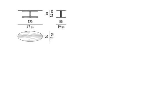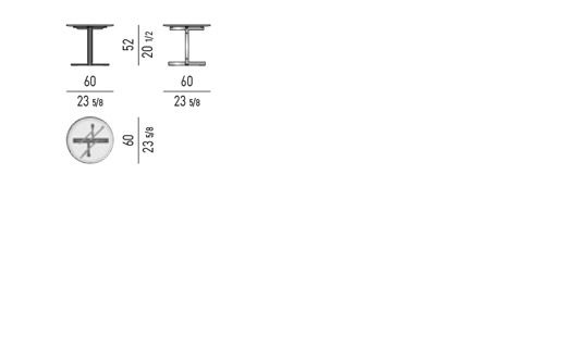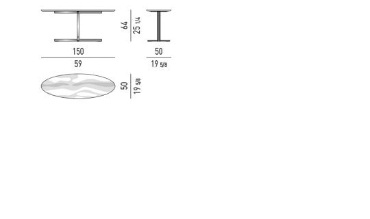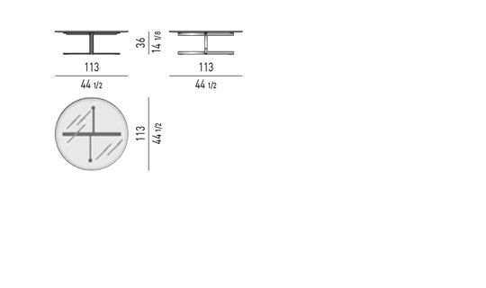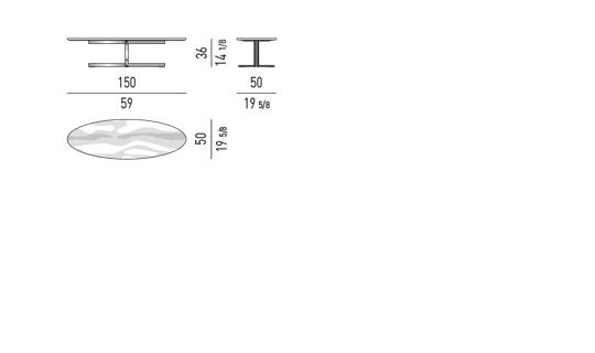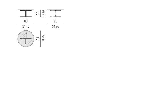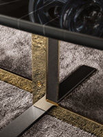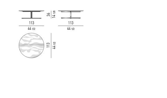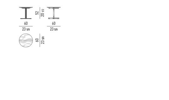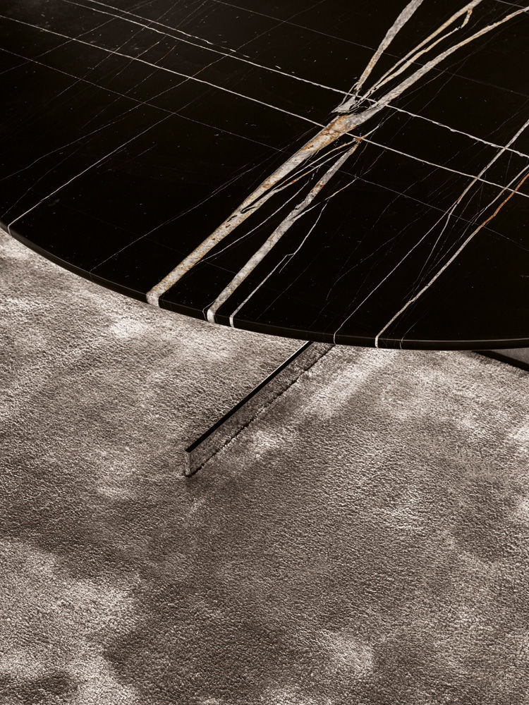 Polished Arabescato Purple marble, 20 mm, beveled; polished Sahara Noir marble, 20 mm, beveled; stratified glass, 8+8 mm, by coupling a sheet of Smoked Grey glass with a sheet of extra-clear glass, total thickness 16 mm. Available only for table diameters of 60, 80 and 113 cm.