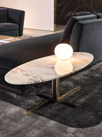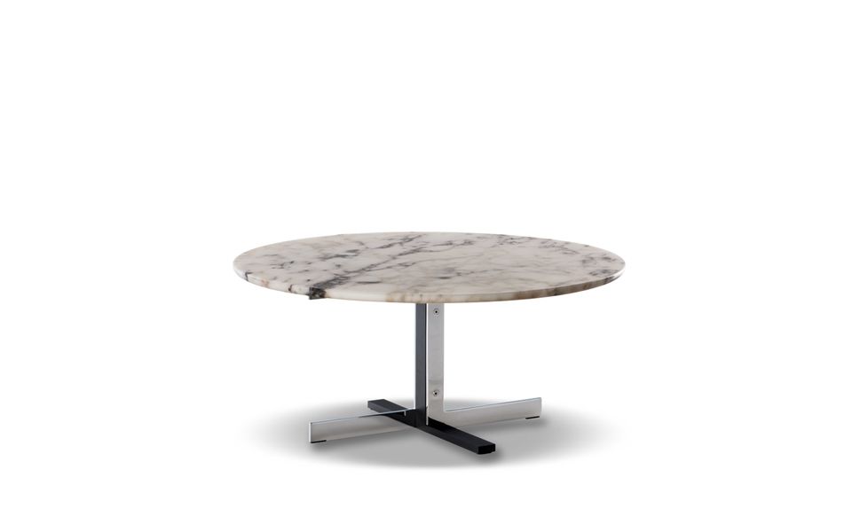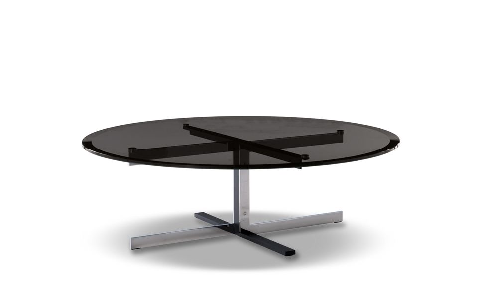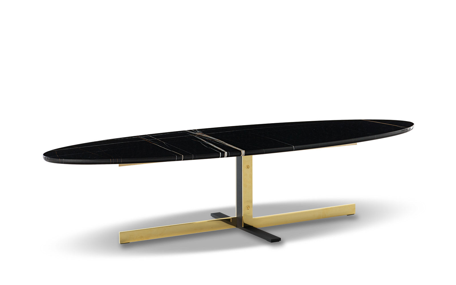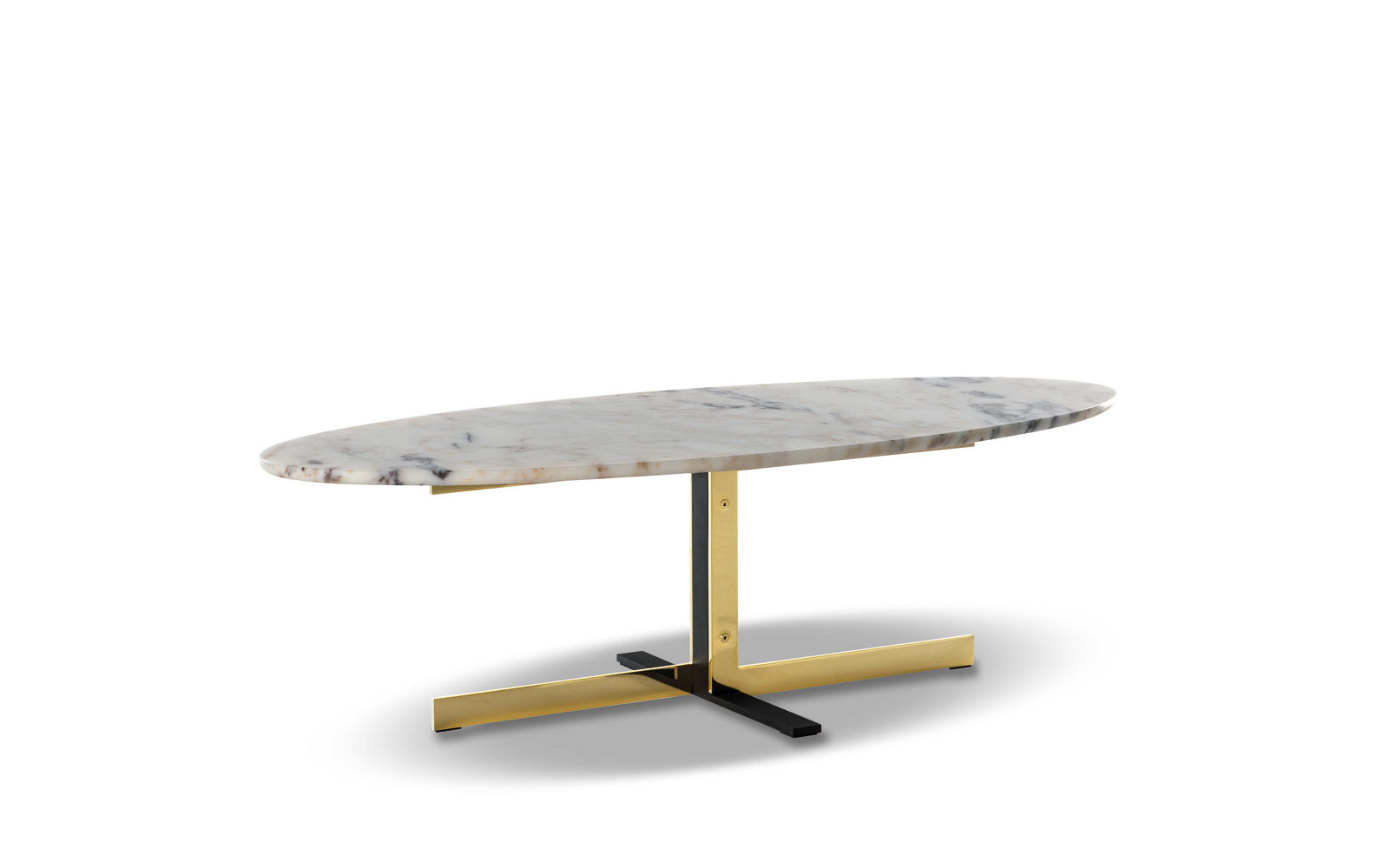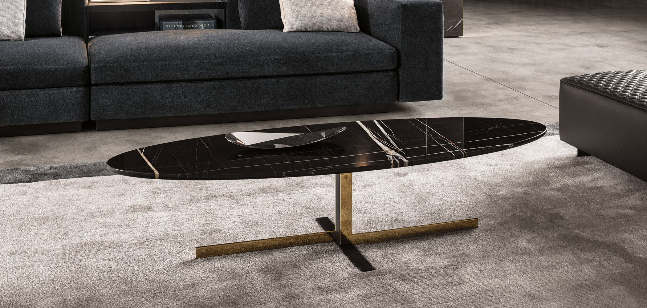 Una colección de mesitas caracterizadas por una sofisticada simplicidad, interpretada en un surtido de materiales que denotan una refinada y compuesta elegancia. Aunque el diseño de la mesita Catlin es intencionalmente simple, la selección de sus materiales apuesta por combinaciones de gran impacto táctil y visual. La base de metal se caracteriza por su sofisticado apoyo en el suelo en forma de cruz y presenta interesantes combinaciones que conducen a diferentes interpretaciones estilísticas: Negro texturizado asociado al acabado Cromo brillante o bien al acabado Oro brillante. La propuesta de combinaciones de materiales dotados de una inédita elegancia continúa en las opciones disponibles para el tablero: vidrio laminado Gris humo y dos mármoles raros y preciados, Arabescato Purple y Sahara Noir, ambos en acabado brillante. La serie Catlin incluye mesitas con tableros de forma redonda y oval disponibles en distintas medidas, así como una consola y mesas de comedor.