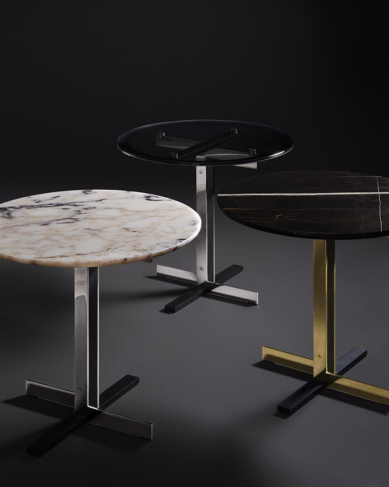 Una colección de mesitas caracterizadas por una sofisticada simplicidad, interpretada en un surtido de materiales que denotan una refinada y compuesta elegancia.