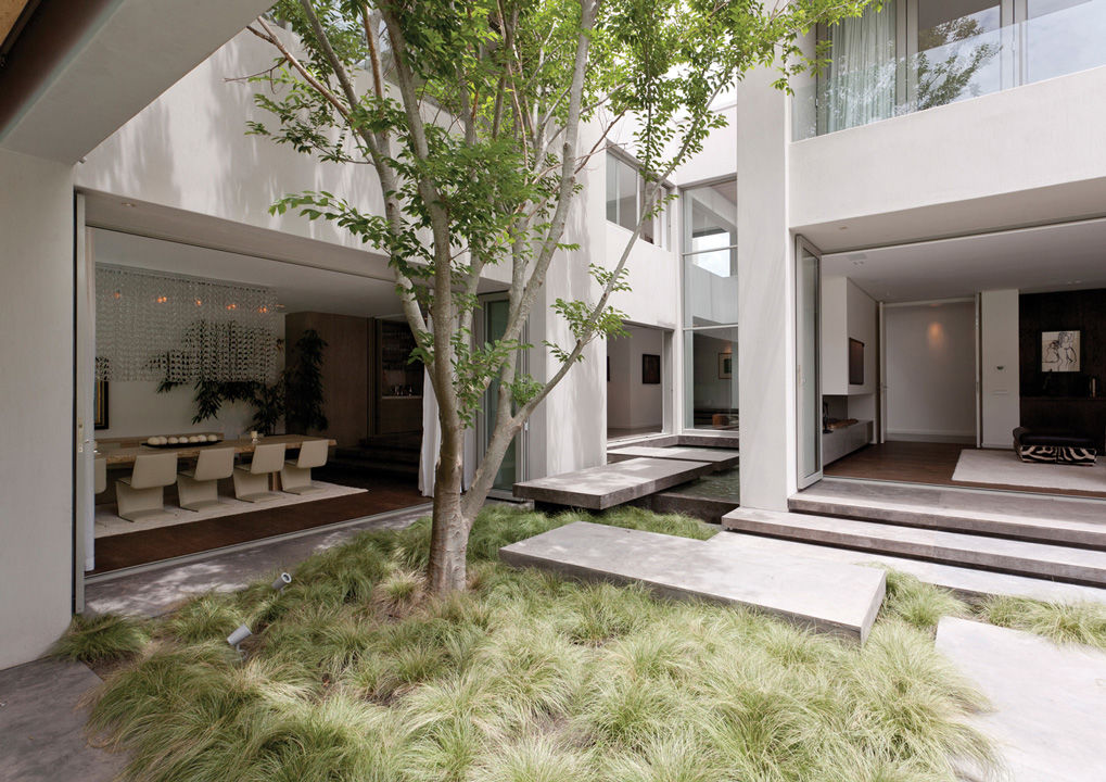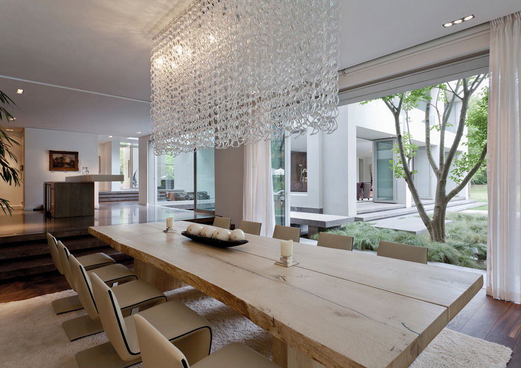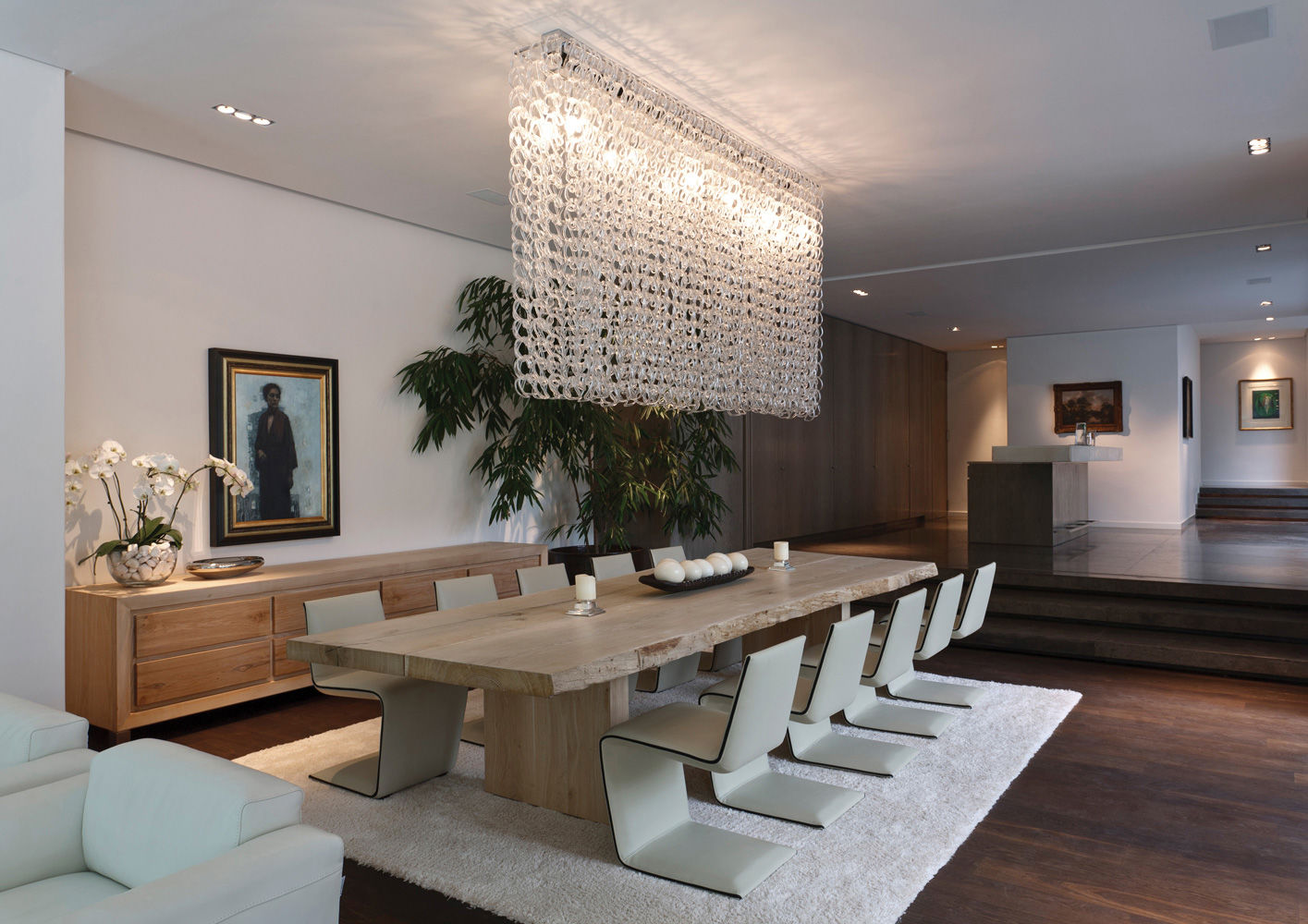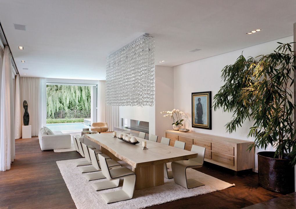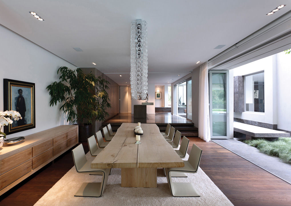 El proyecto de este chalé puede considerarse una interpretación moderna del clásico estilo georgiano que caracteriza muchas viviendas exclusivas de la zona de Constantia, en los alrededores de Ciudad del Cabo, célebre por la calidad de sus vinos. El estudio SAOTA (Stefan Antoni Olmesdahl Truen Architects) ha ofrecido una original contribución a esta tradición, basada en una organización fluida del espacio que se caracteriza por un lenguaje de ligereza y comunicación entre ambientes interiores y exteriores. En la misma idea se inspiraron las elecciones del estudio Antoni Associates, que se ocupó del proyecto de diseño de interiores, armonizando piezas únicas realizadas según diseño con elementos de producción contemporánea. La zona comedor es una magnífica síntesis de esta filosofía proyectual con una imponente mesa de madera maciza de roble francés rodeada de sillas escultóricas Phillips revestidas en piel en un elegante tono de beige.