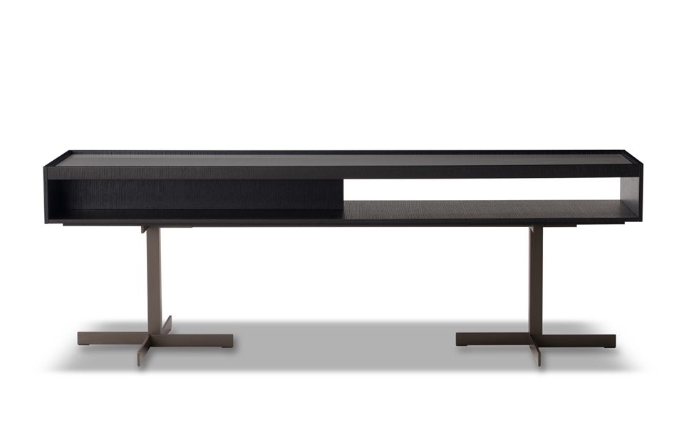 La base es de metal en acabado Bronce, mientras que la parte superior —formada por un compartimento abierto— está disponible con estructura en Roble lacado Moka con poro abierto y tablero superior lacado brillante Arcilla o con estructura lacada mate Arcilla y tablero en Roble lacado Moka con poro abierto.