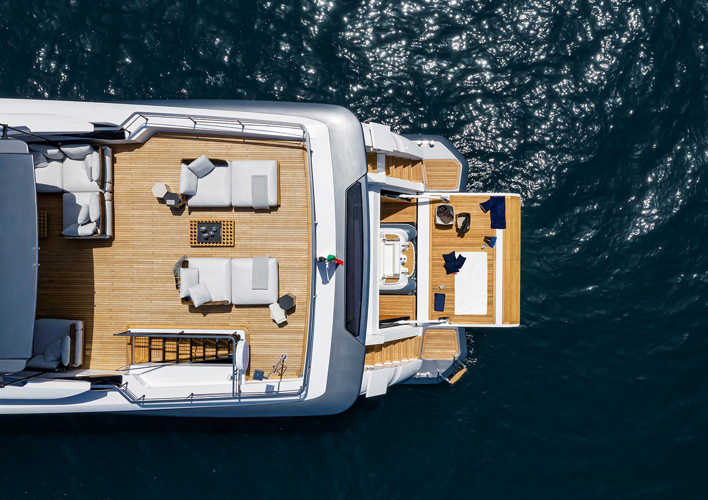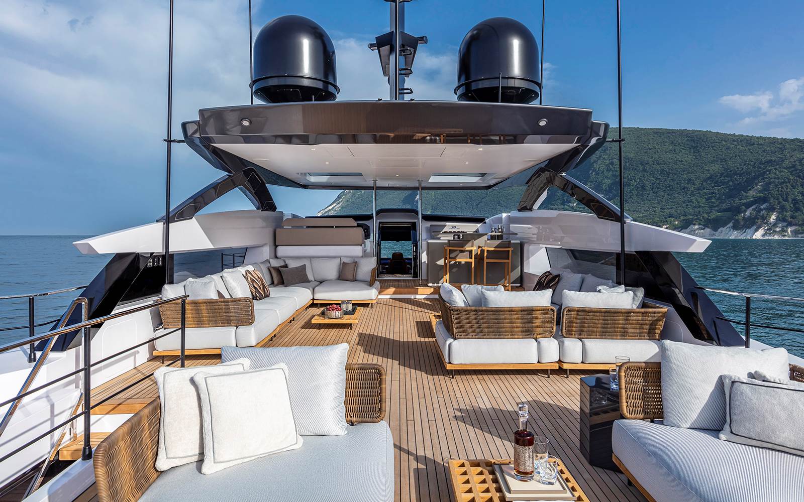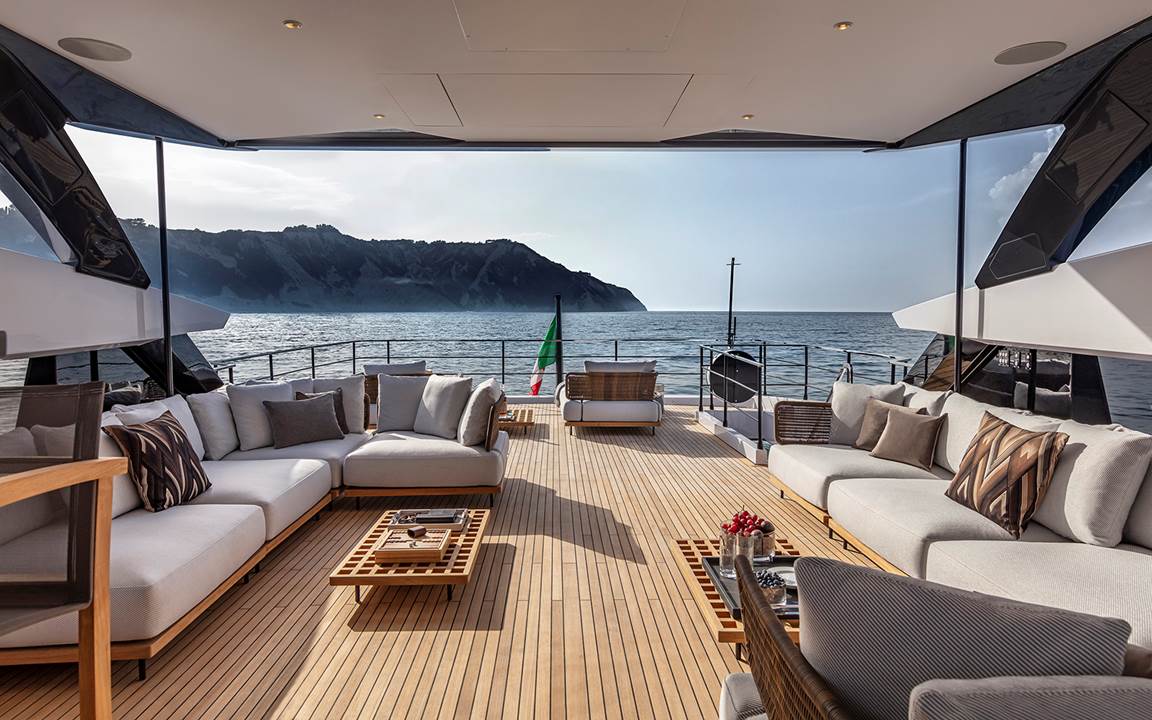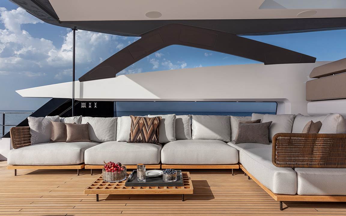 Entre las áreas externas, la sobrecubierta, protegida por dos amplias cristaleras laterales, ofrece un espacio de 53 m2 protagonizado por la colección Quadrado —articulada en dos amplias composiciones de asiento, diván y mesitas— firmada por el arquitecto brasileño Marcio Kogan / studio mk27: un proyecto modular caracterizado por sus plataformas rectangulares suspendidas que retoman el esquema del enjaretado, la rejilla de teca que se utiliza en la náutica para favorecer el flujo del agua. En el extremo de popa de la sobrecubierta, cuatro mesitas Aeron completan el conjunto: dos grandes en lacado color granito y dos más pequeñas en lacado color arena.