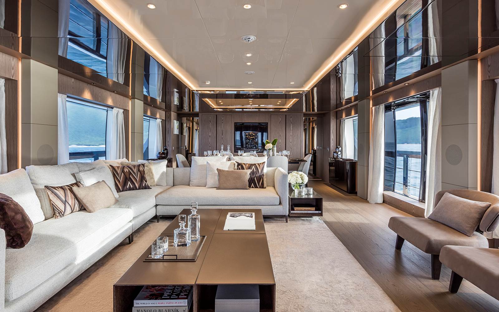 El yate explora un delicado equilibrio formal experimentando con fuertes contrastes cromáticos en los muebles y revestimientos que caracterizan los distintos ambientes del salón, el comedor y los dormitorios. El gran open space de 40 m2, con alturas que superan los dos metros, incluye un salón y una zona de comedor adyacente donde destaca una rica selección de piezas de la firma Minotti. En el centro del salón, un sofá en "L" Andersen Slim revestido en un delicado tejido color nata aparece acompañado de dos sillones Reeves en color gris y de mesitas Gray en chapa de metal con acabado bronce satinado, todo ello firmado por Rodolfo Dordoni, recreando un espacio de gran armonía y elegancia. Numerosos complementos y accesorios confieren unicidad y personalidad al salón, sumándose a las obras de maestros contemporáneos que guían el recorrido decorativo de los interiores de la barca.