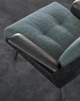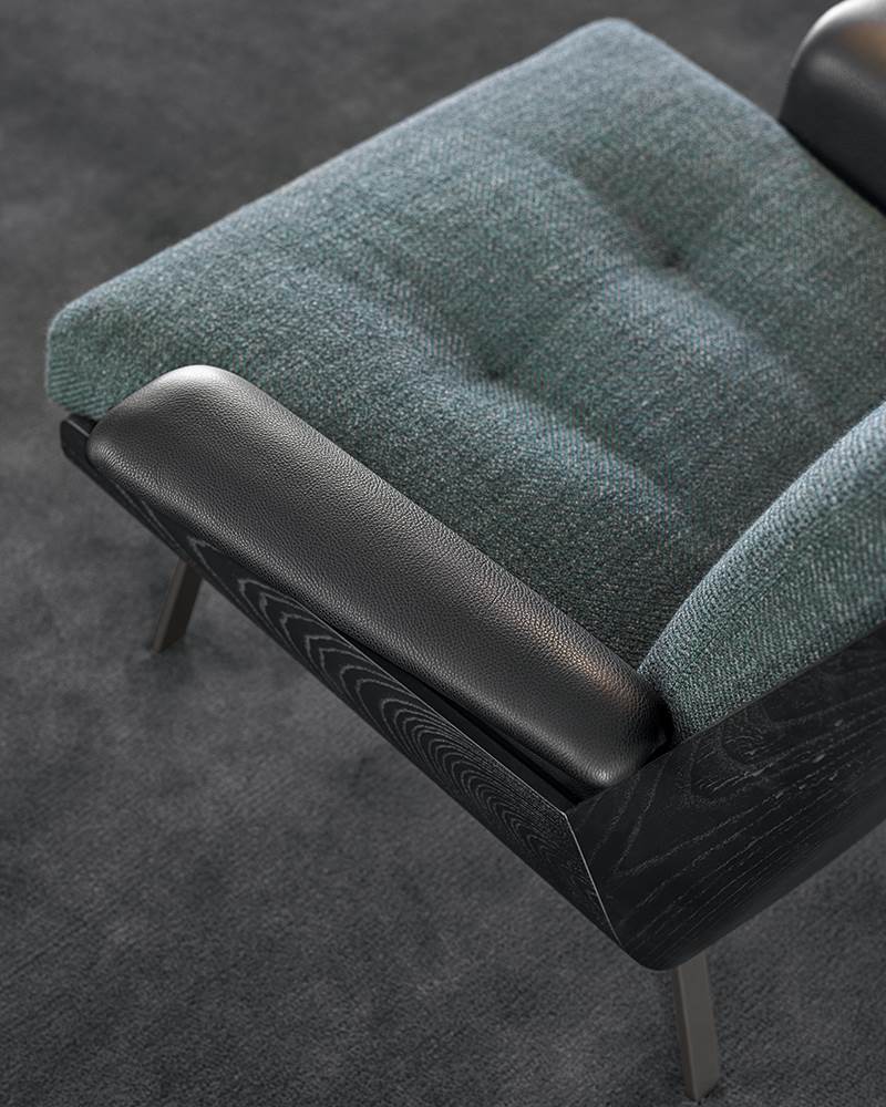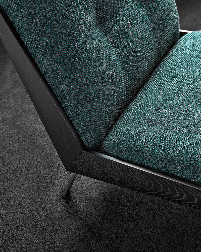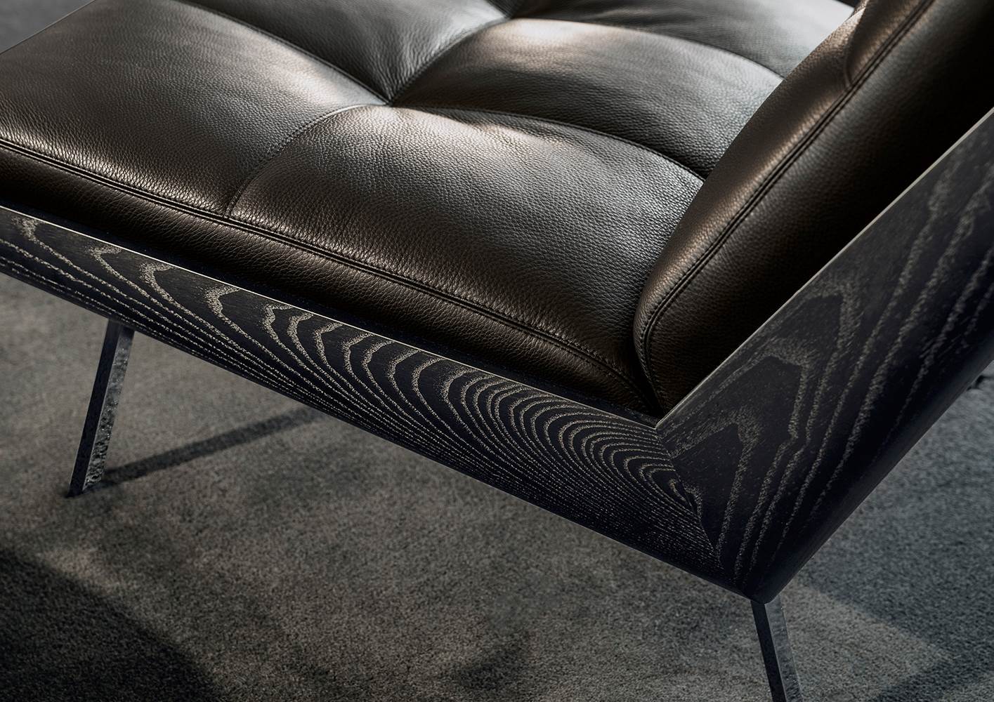 F) external shell in flamed ash veneer with open-pore Licorice colour lacquer; cushions in fabric and armrests in Aspen leather (Cat. Nature Leather) Charcoal colour.
