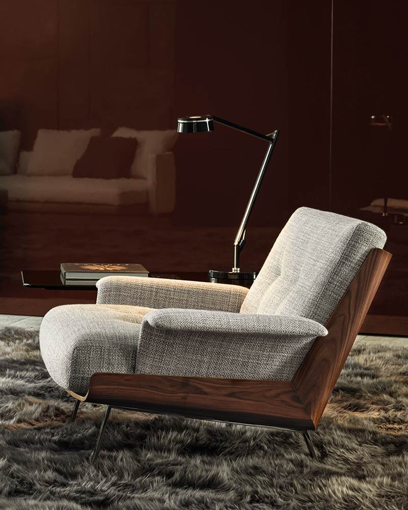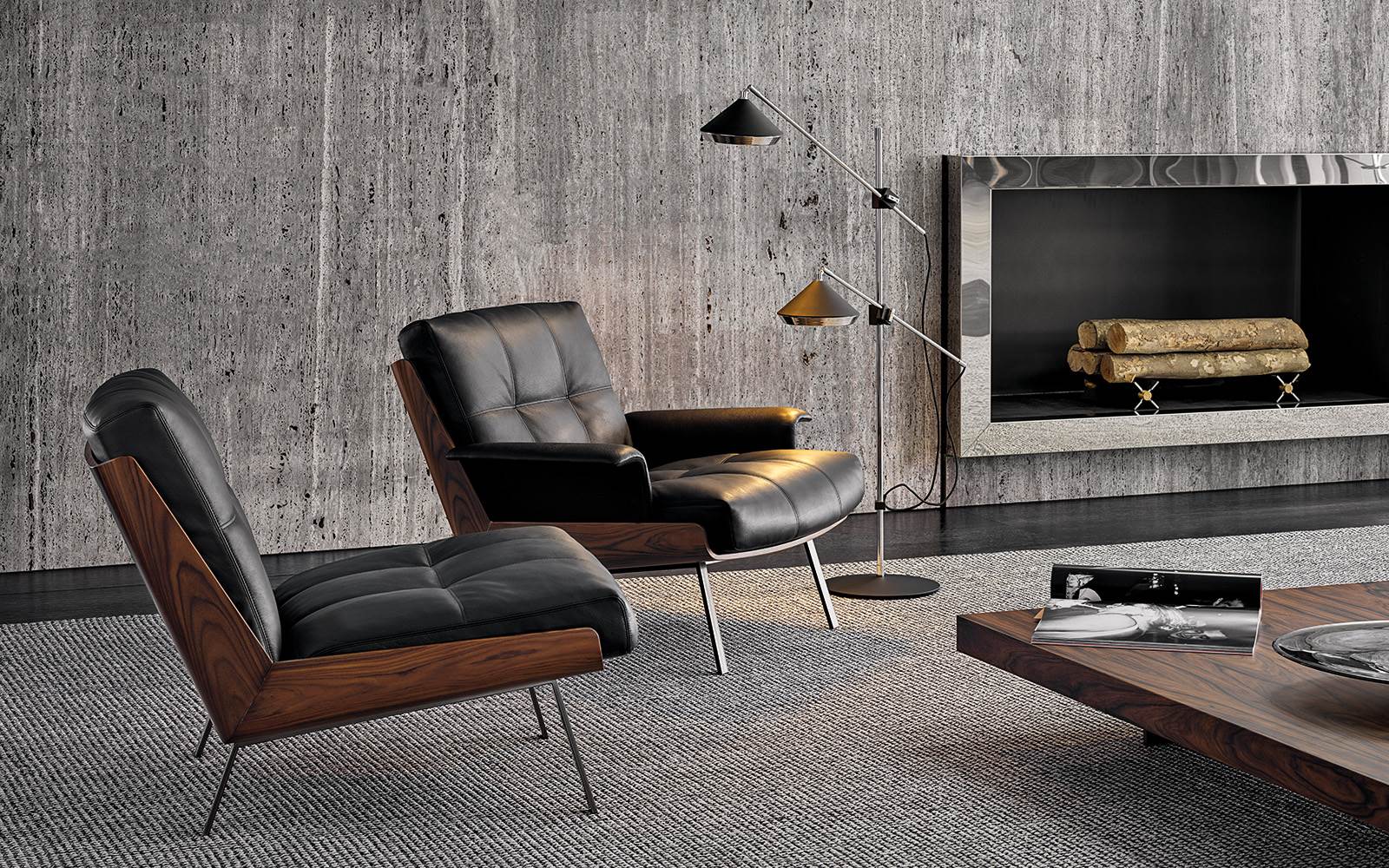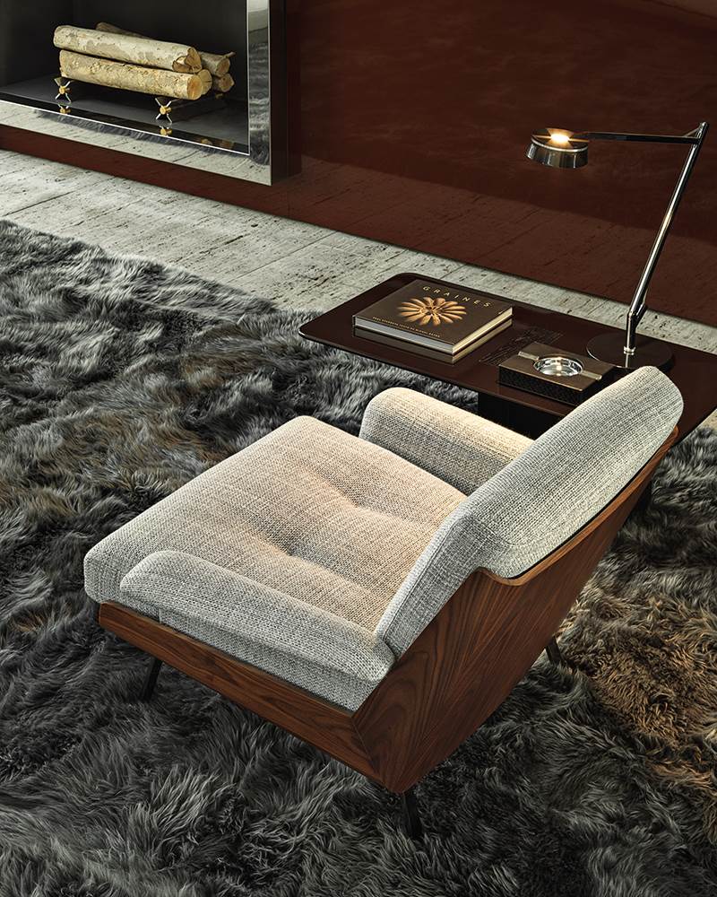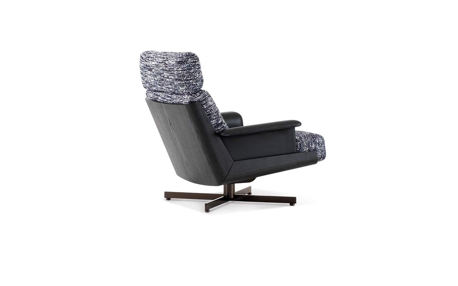 F) external shell in flamed ash veneer with open-pore Licorice colour lacquer; cushions in fabric and armrests in Aspen leather (Cat. Nature Leather) Charcoal colour.