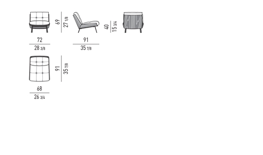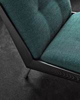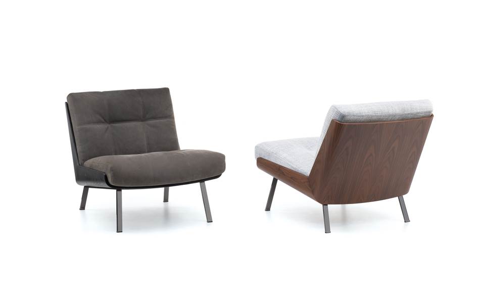 Seat cushion and backrest in channeled goose down (Assopiuma certified, Gold Label) undergo routine sanitization as specified in EC Regulation No. 1069/2009, with core insert in high-resilience, variable-density polyurethane foam. In the fabric upholstery version, the upholstery features a top-stitching detail; in the leather version, the upholstery is lightly quilted with top-stitched detail. The seat and backrest cushions are joined by a zipper.