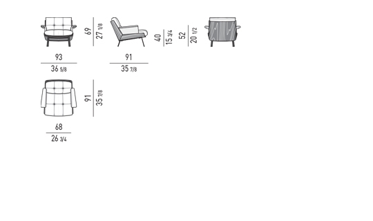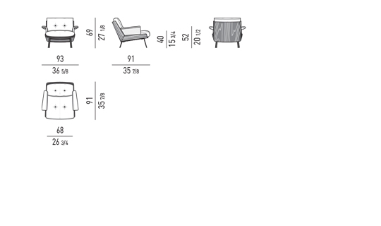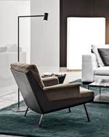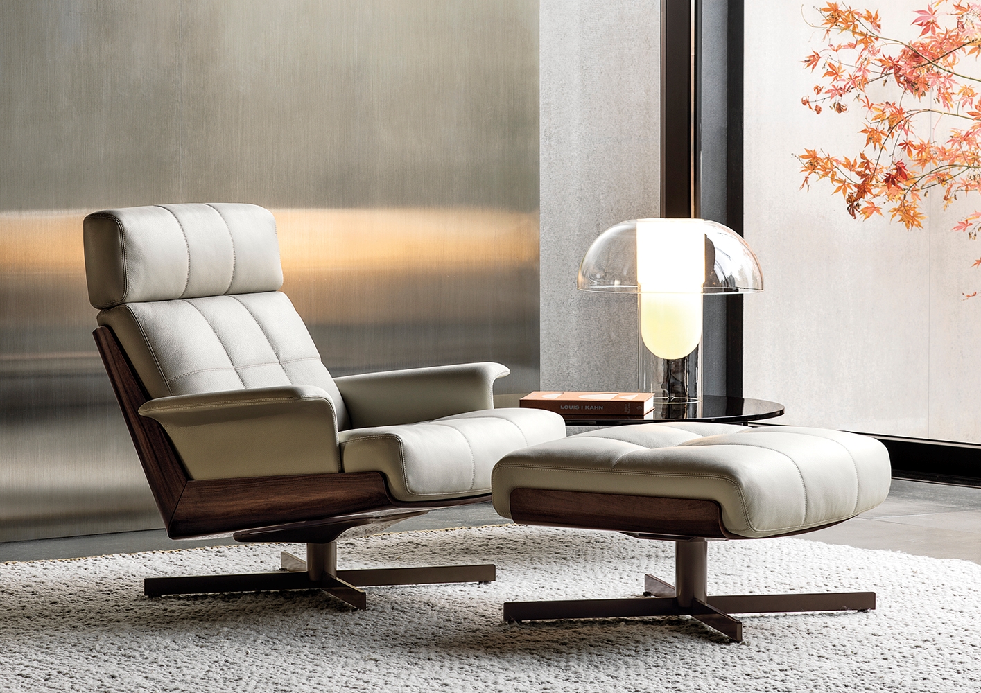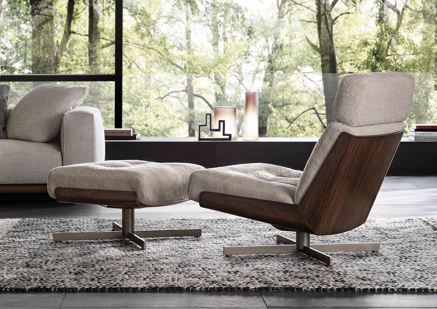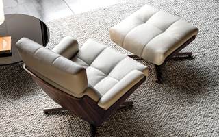 La familia incluye cómodas bergères, sillones con asiento fijo, sillones giratorios, con o sin reposabrazos y reposapiés con base fija.