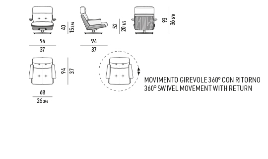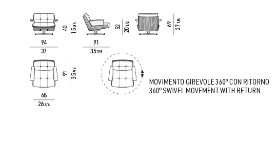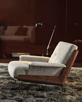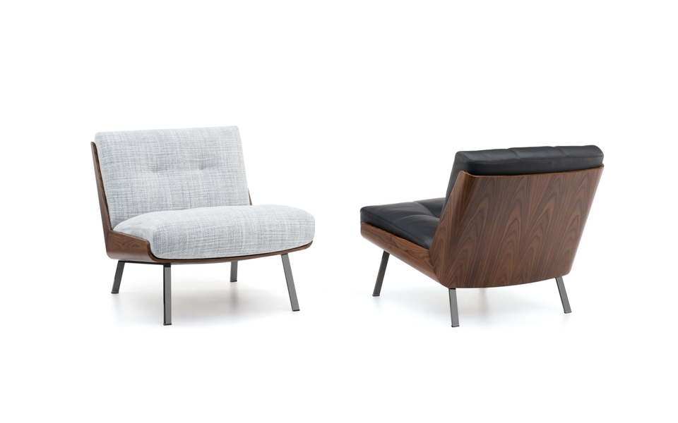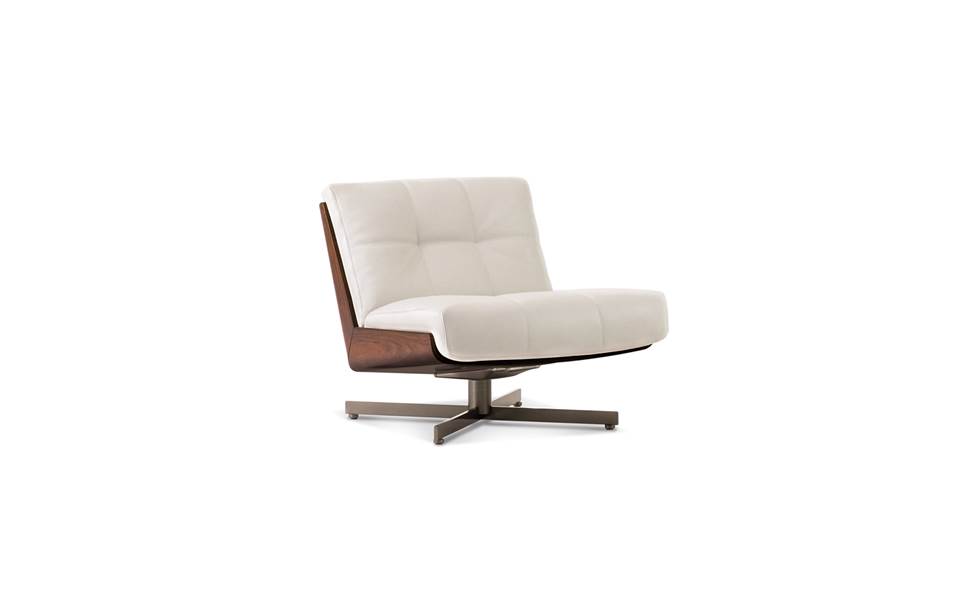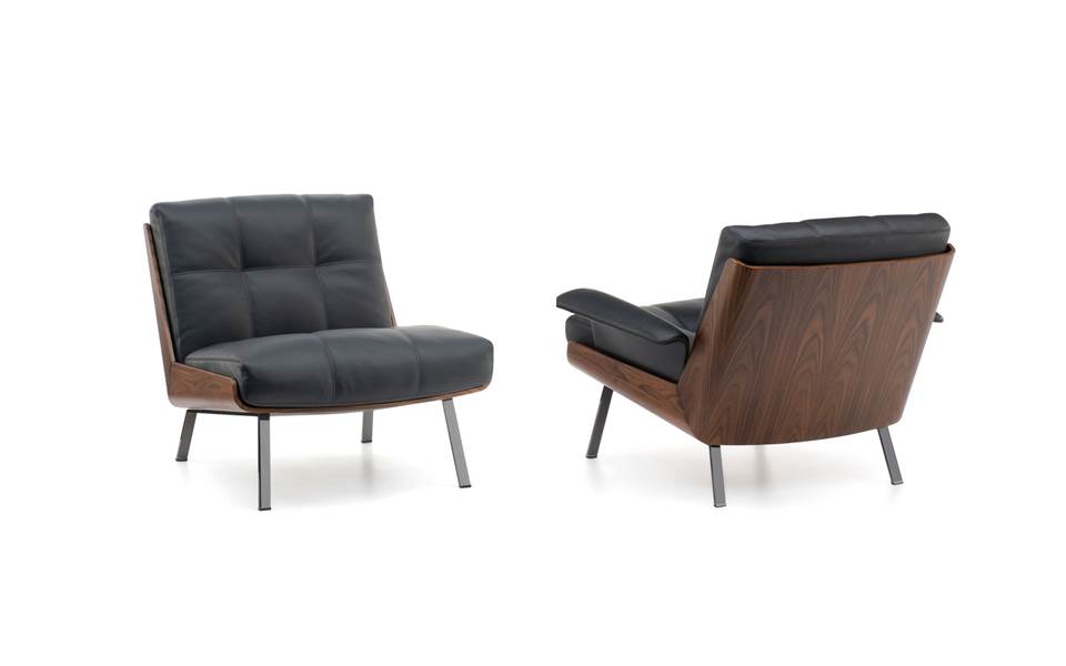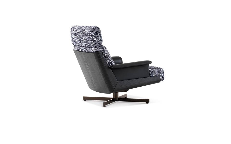 Disponible con bastidor en Palisandro Santos lacado poliéster mate en tinta Dark Brown o en fresno flameado lacado Liquirizia, el asiento está realizado mediante una técnica exclusiva de carpintería y compuesto por dos elementos unidos a 45° para obtener una inclinación del respaldo lo que garantiza el máximo confort. Los sillones con asiento fijo cuentan con patas de metal acabado Black-Nickel, mientras que los sillones giratorios se apoyan en una base metálica con radios, giratoria 360° con retorno, sobre la que hay un cómodo cojín, contenido en el bastidor curvo de madera.