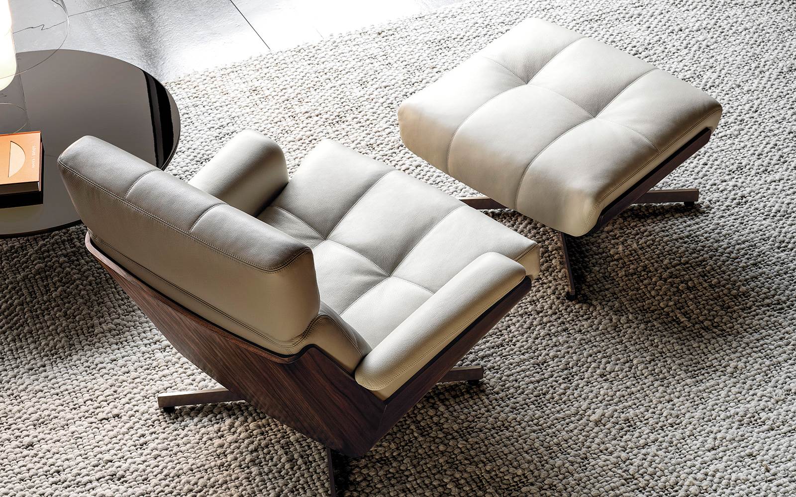 D) external shell in palisander Santos, cushions upholstered in fabric and armrests in Aspen leather (Cat. Nature Leather) Charcoal colour; E) external shell in flamed ash veneer with open-pore Licorice colour lacquer; cushions and armrests upholstery entirely in leather or fabric;