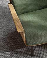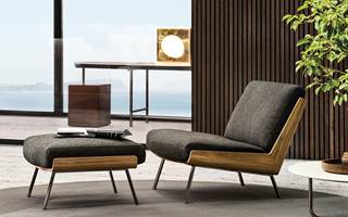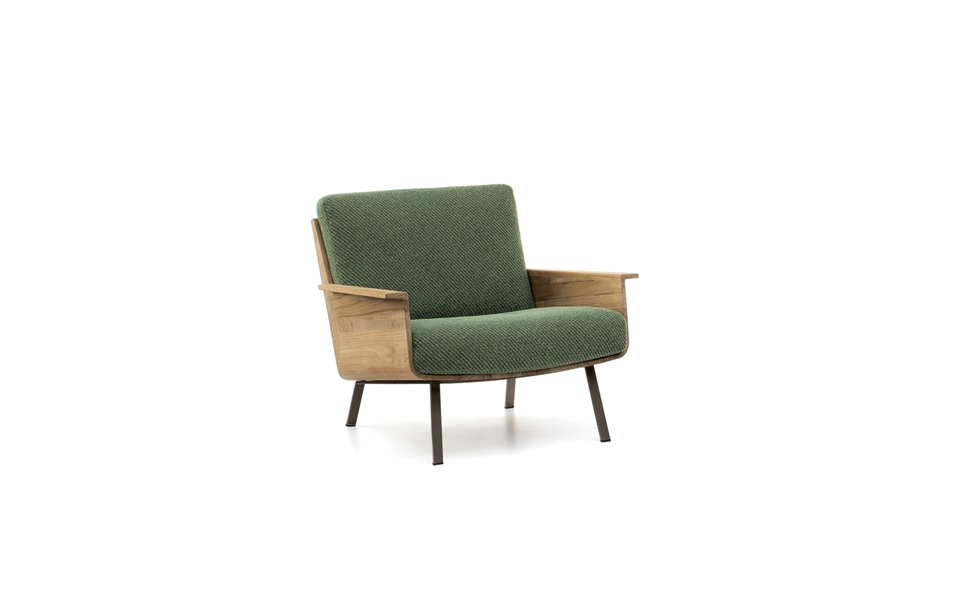 Realizado mediante una sofisticada manufactura de la madera, el bastidor curvo de madera maciza de teca natural está compuesto por dos elementos unidos a 45° con una inclinación del respaldo que asegura el máximo confort. En la versión de exteriores, el bastidor acoge con precisión los cojines y apoya sobre una estructura de acero con patas barnizadas en color Bronce brillante.
