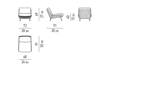 La familia incluye sillones de asiento profundo con y sin brazos, una butaca de comedor y pufs reposapiés.