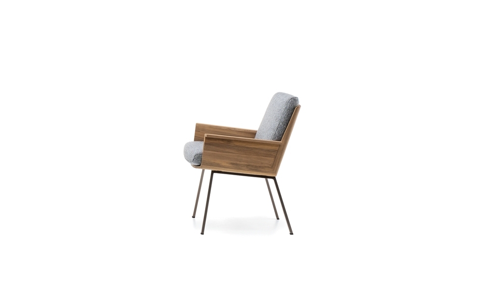 Realizado mediante una sofisticada manufactura de la madera, el bastidor curvo de madera maciza de teca natural está compuesto por dos elementos unidos a 45° con una inclinación del respaldo que asegura el máximo confort. En la versión de exteriores, el bastidor acoge con precisión los cojines y apoya sobre una estructura de acero con patas barnizadas en color Bronce brillante.