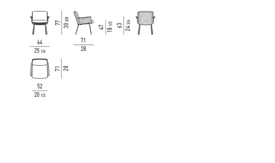 La familia incluye sillones de asiento profundo con y sin brazos, una butaca de comedor y pufs reposapiés.